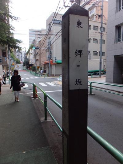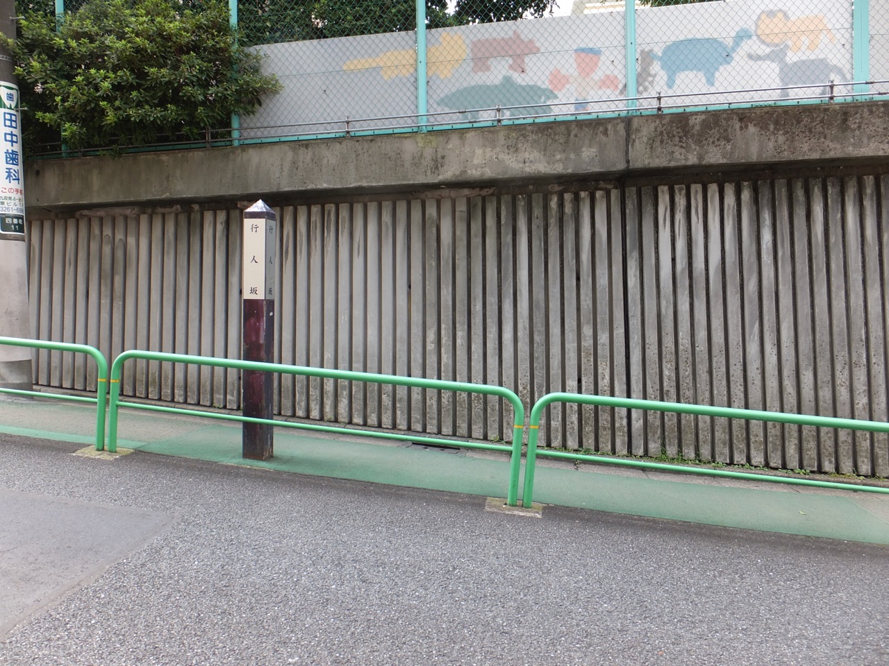 市ヶ谷駅から半蔵門駅まで歩くと、いったん谷に降りてまた登り、また降ります。最初の降りる坂が東郷坂で、登る坂がこの行人坂です。なので、東郷坂と谷を挟んで向かい合うかたちになります。その先にまた降りる坂が南法眼坂。昔は全部まとめて法眼坂と言っていたとのこと。