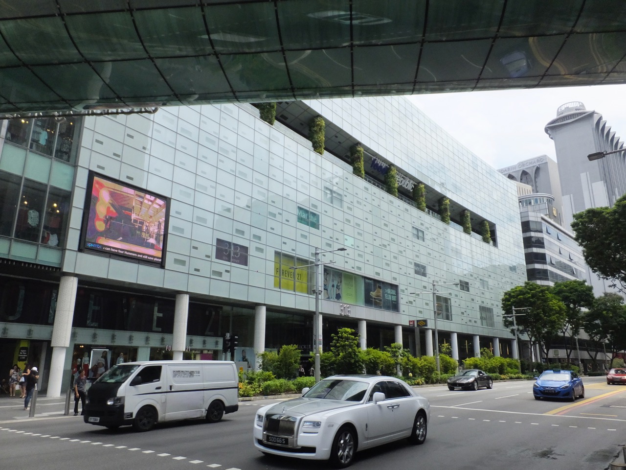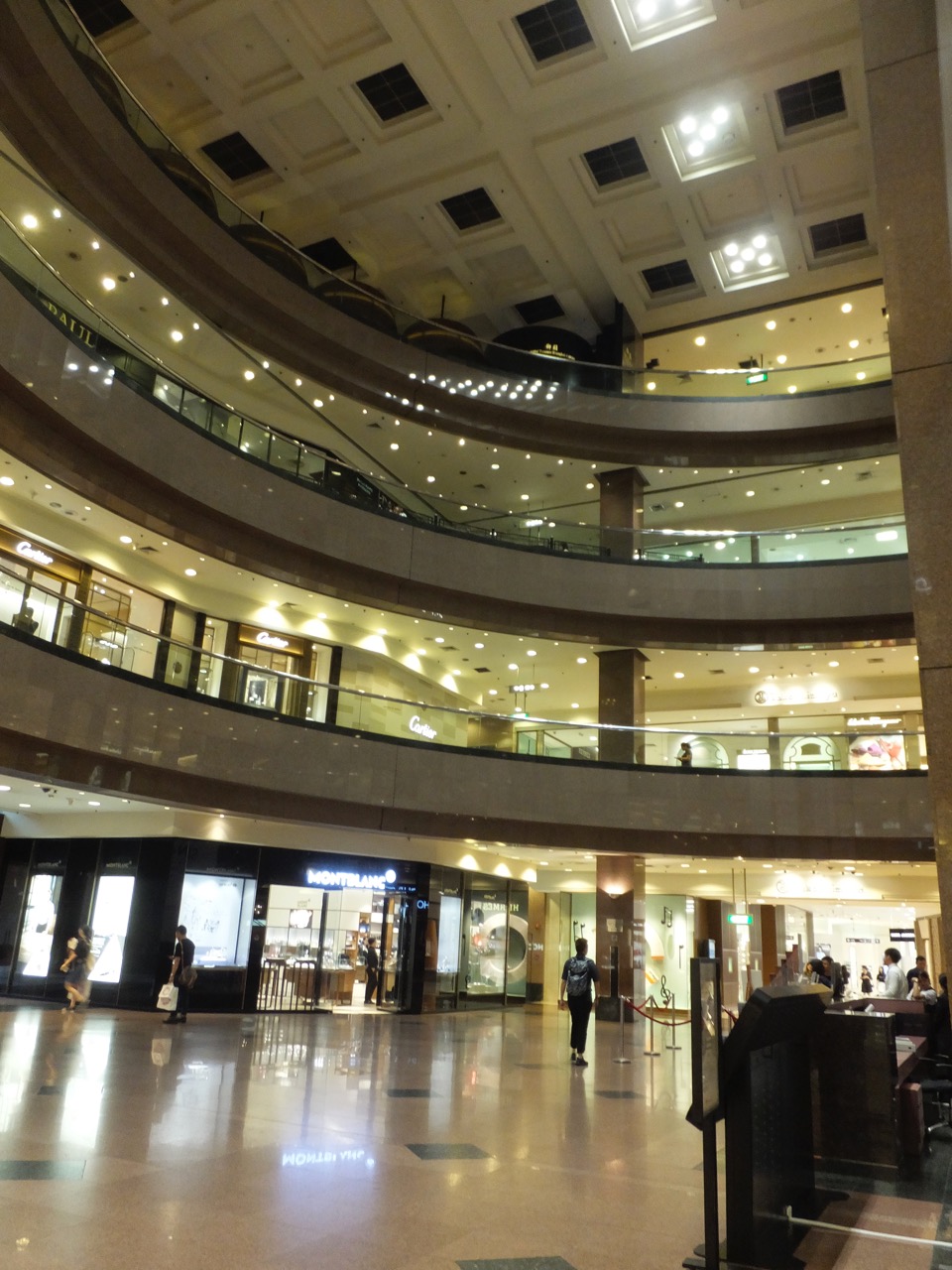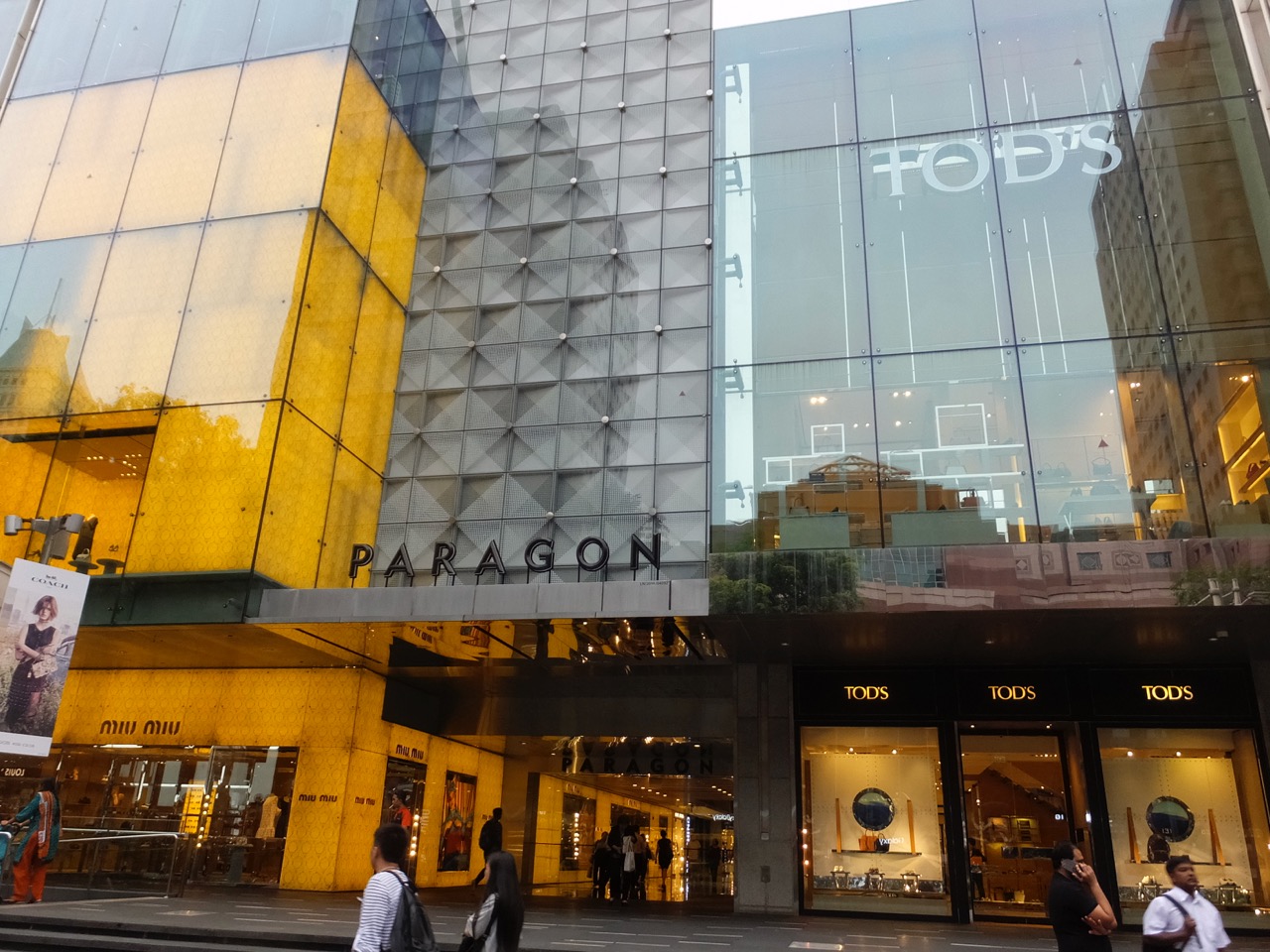 オーチャード通りでは奇抜な外観でないと目立たない、という感じで各デパート・ショッピングビルは目立つ形や色で訴えかけてきます。このパラゴンは金色と銀色のぴかぴかな感じで存在を主張しています。外観からして高級ショップが中心か、と思いましたが、普通のショッピングビルという感じです。