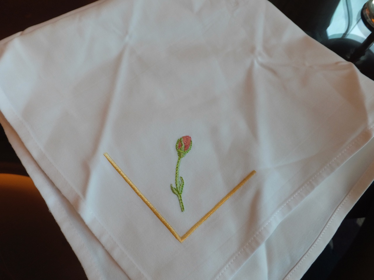 お店の方の制服がとっても素敵。細い長い切れ込みのある青灰色のロングドレス。にこやかにお席まで。