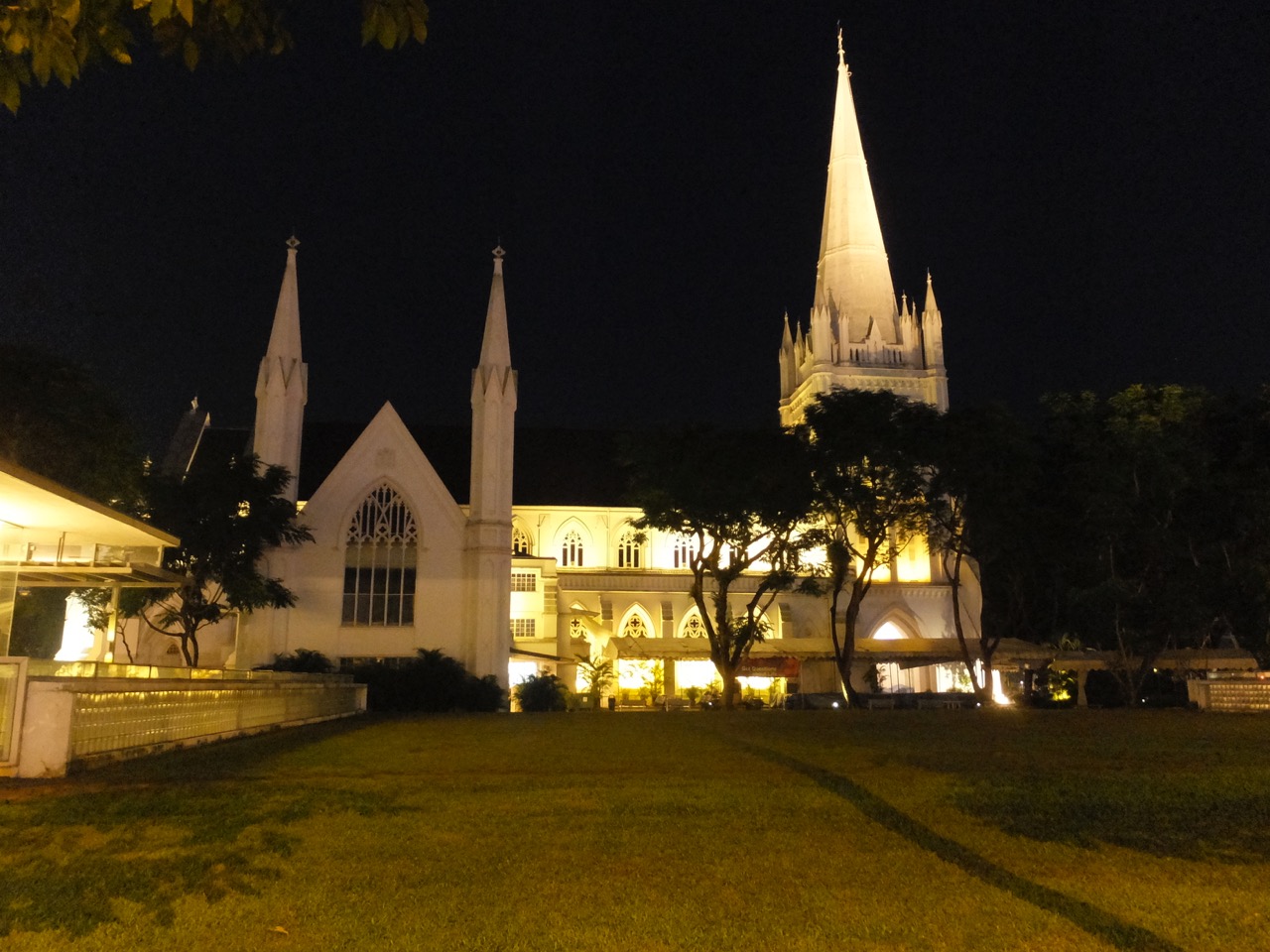 さて、昼の白さも印象的ですが、夜のライトアップもきれいです。単色で上品な感じも教会らしくていいです。- 旅行時期