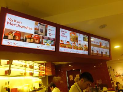 ホテルの朝食でもよかったのですが、せっかくシンガポールにきたのだから、と、ホテル近くのブギスジャンクションの地下にあったヤ・クン・カヤトーストでカヤトーストでの朝食を、ということになり、訪問。朝何時から開いているか不安だったのですが、8時すぎの訪問時にはすでに開店していました。いろんなセットがありますが、普通は生卵とのセットを頼むようです。店頭表示は4.8ドル(約400円)のセットメニューばかり。しかし、単品もありました。注文してから出来たら呼ばれるタイプ。たっぷり練乳のコピ(コーヒー)といっしょにどうぞ。