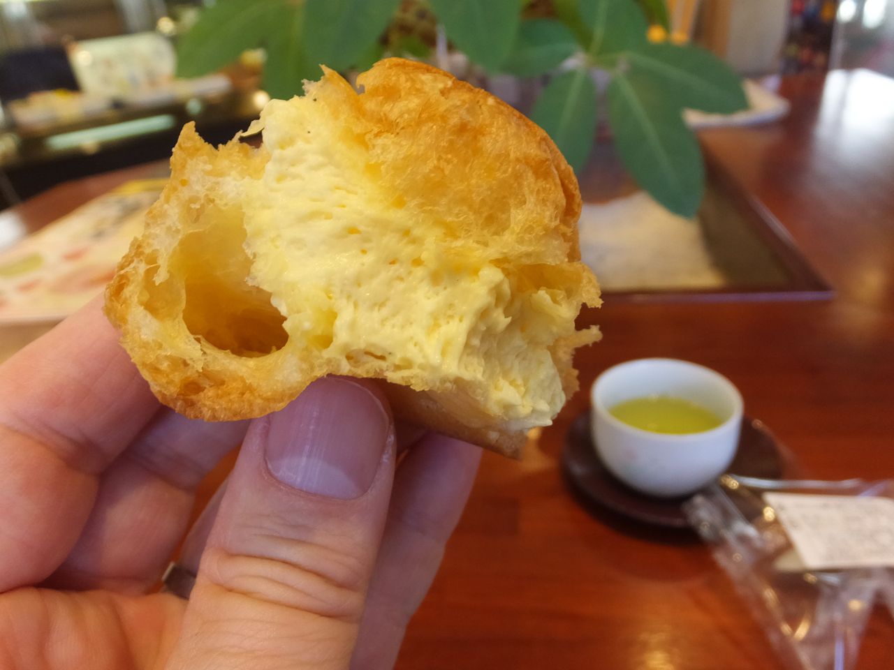 店内は広々。奥の方には洋生菓子があり、甘夏みかんのシュークリームが美味しそうだったので購入し、店内でいただきました。(ちょっとだけ机と椅子がありました。地方発送用の書類書きのスペースでもあるようです)お茶もいただけました。甘夏の風味がシュー皮の苦みとバランスして美味しかったです。- 旅行時期