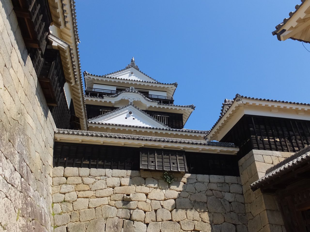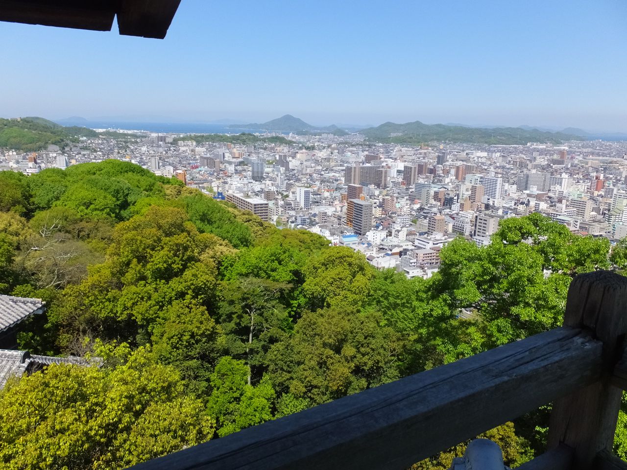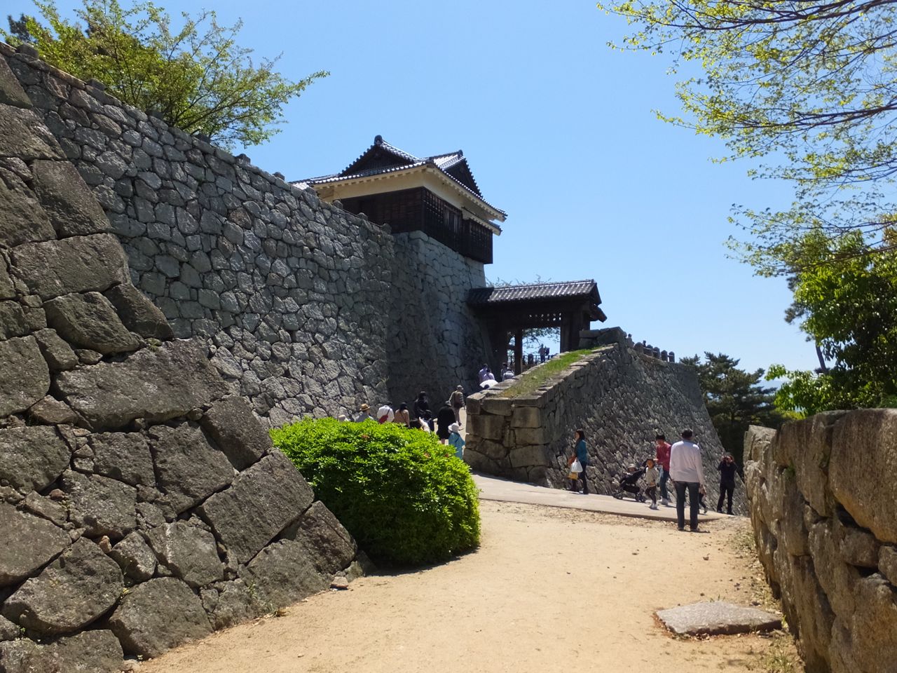 大天守と小天守、それと北隅櫓と南隅櫓の4つの櫓とその間を結ぶ通路状の櫓で四角形になり、その中に中庭があり、ここが天守への入口になります。この構造を連立式天守といいます。中に入ることができ、天守からの松山市や瀬戸内海の眺めはすばらしいです。標高約160mです。天守閣自体はそう高いものではないですが、城山の標高が高いのですばらしい松山の展望台です。城に登った登頂感が味わえます。