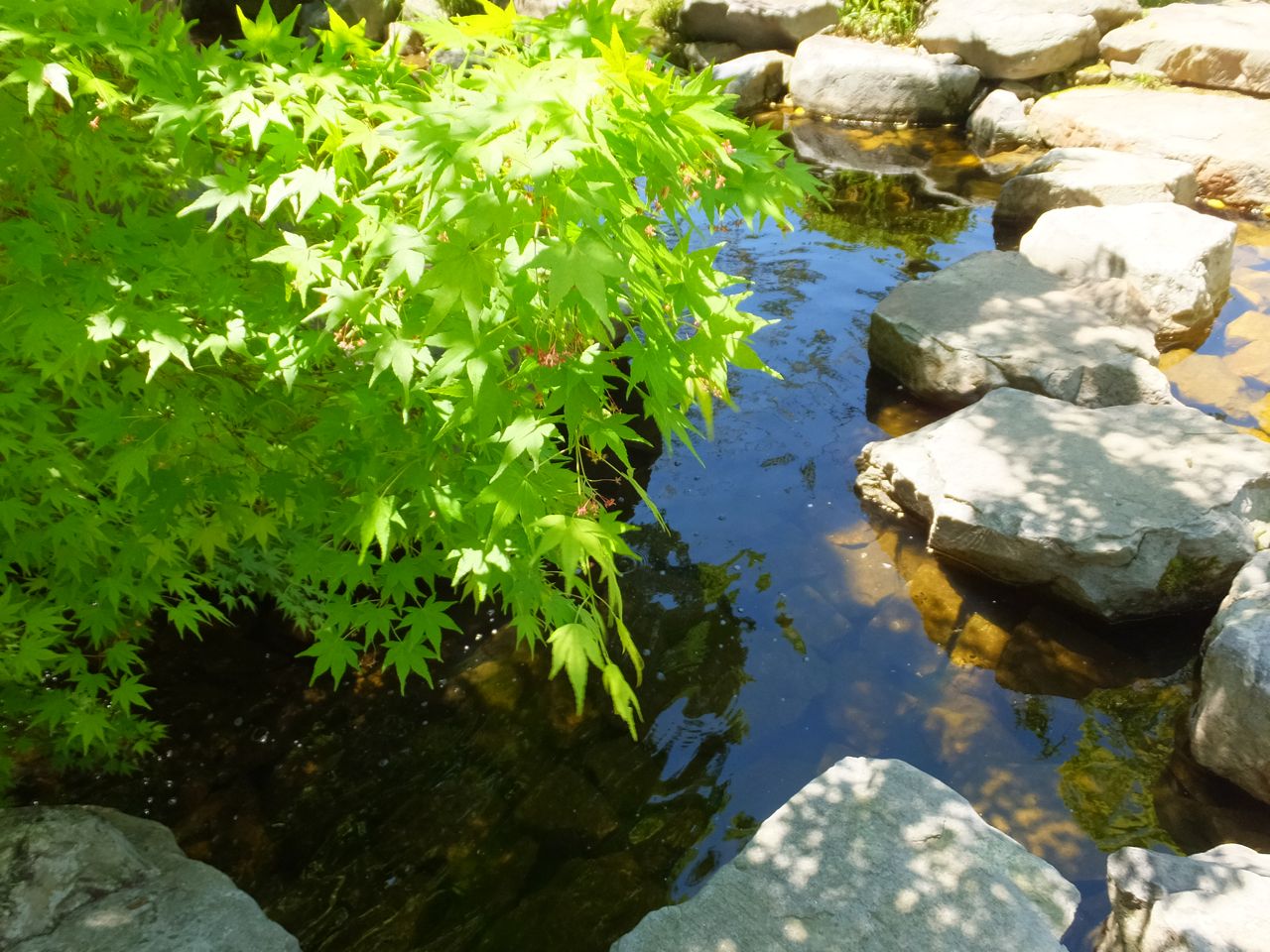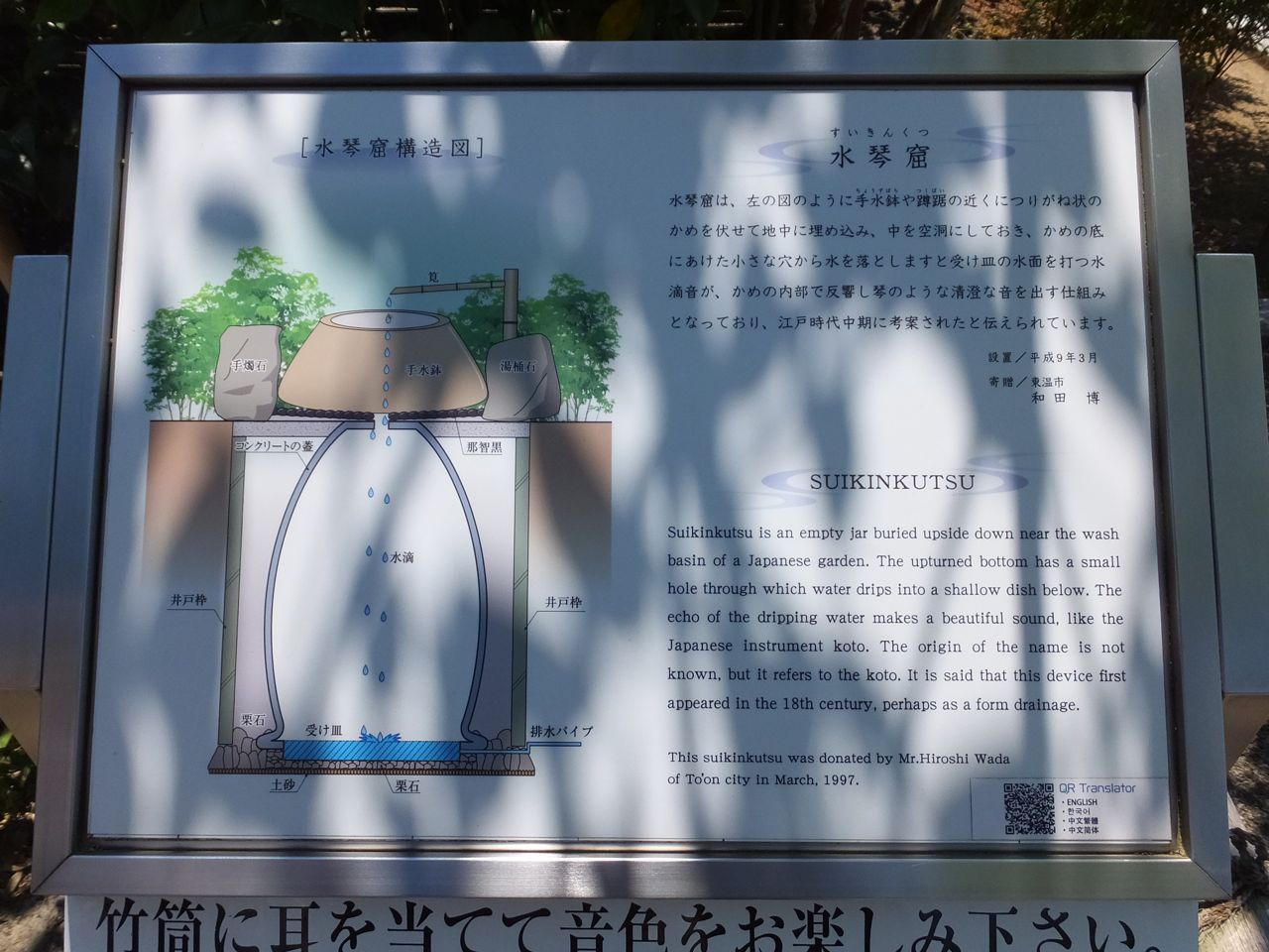 見どころは、周囲の山や野にあり、つつじや紅葉がきれいなこと、茶室があること、昔の深い井戸があること、です。茶室には水琴窟もあります。きれいな音を聞くことができます。