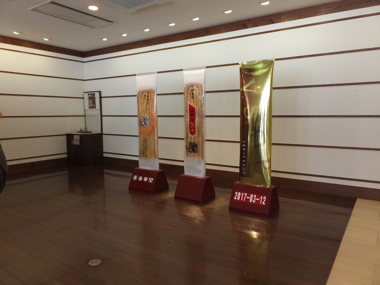 ちょっと離れた別の春華堂の工場の脇のニコエの売店にはアウトレットがあって、そちらだと割れたものや浮きの悪いうなぎパイが安価に売られてますが、こちらの工場売店は定価のものしかなかったのが残念でした。ただ工場見学でうなぎパイの3枚入りだったかの詰め合わせを一袋いただけたので、その点ではお得でした。- 旅行時期