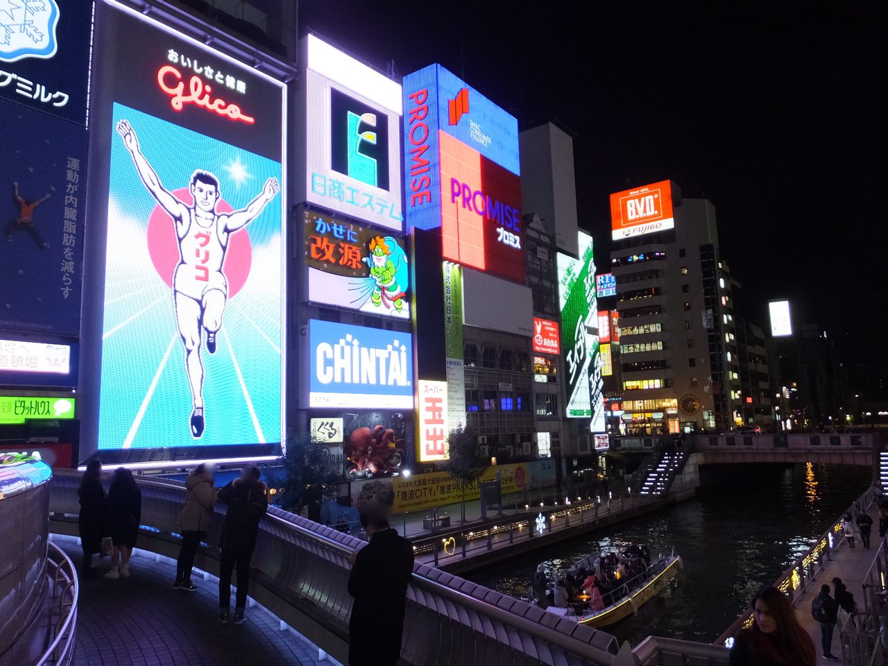 言わずと知れたグリコの看板で有名な道頓堀川の歩行者専用の橋。川をみるための人用に2段になって居るのが親切な設計です。観光客でごったがえしてます。後ろではやはりどこから来たのーとかいう昔ながらのナンパの声が聞こえてきます。まだまだ健在のようです。でも大阪にきたからにはこの場所は必見です。ごちゃごちゃ文化の象徴のような場所でした。