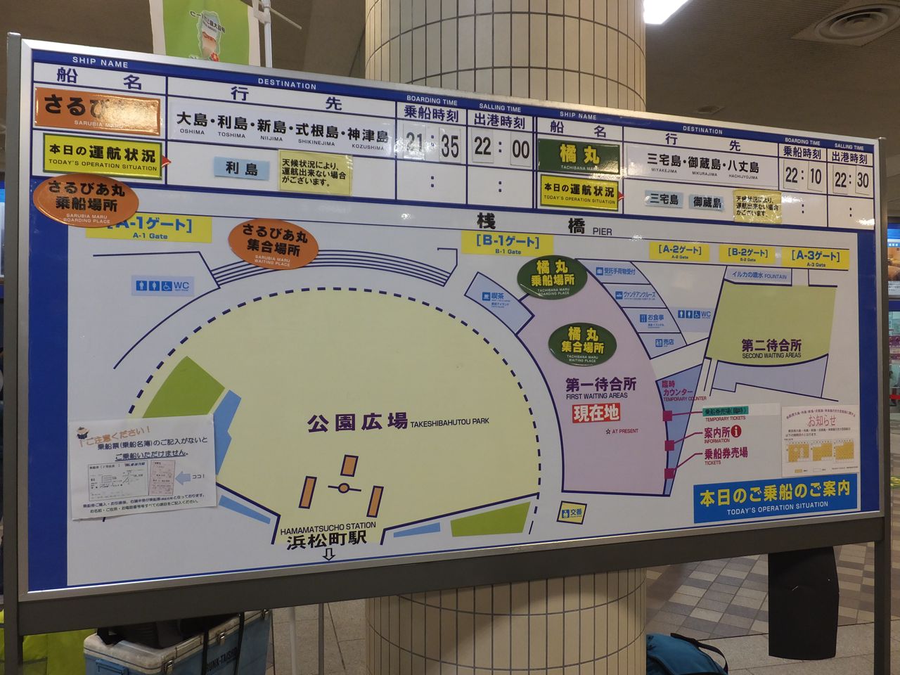 そしてこの桟橋は、夕方から夜にかけては伊豆航路の大型客船が休んでいるので船を眺めるにもいいですね。ターミナルビル横のデッキの上からきれいに見えます。- 旅行時期