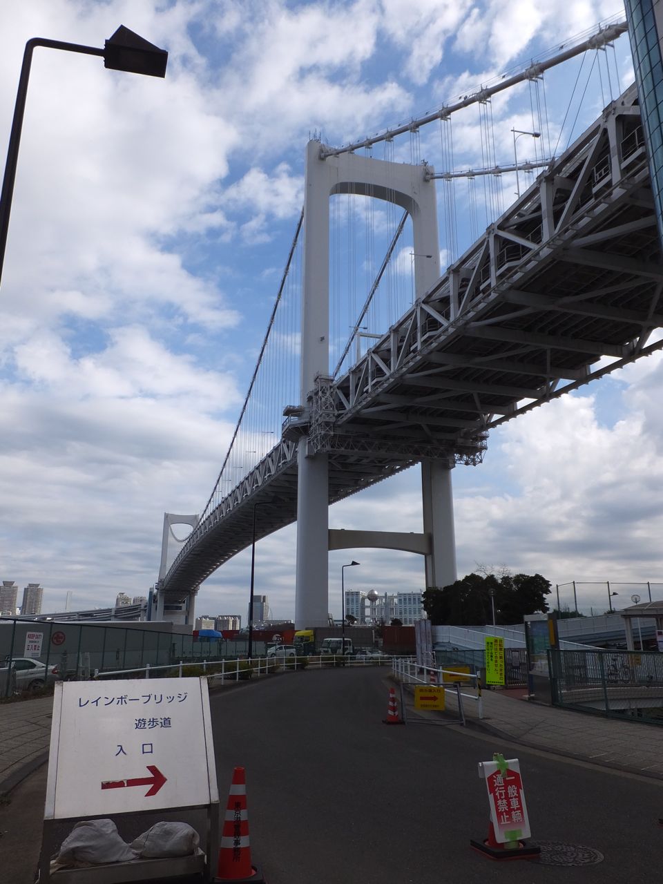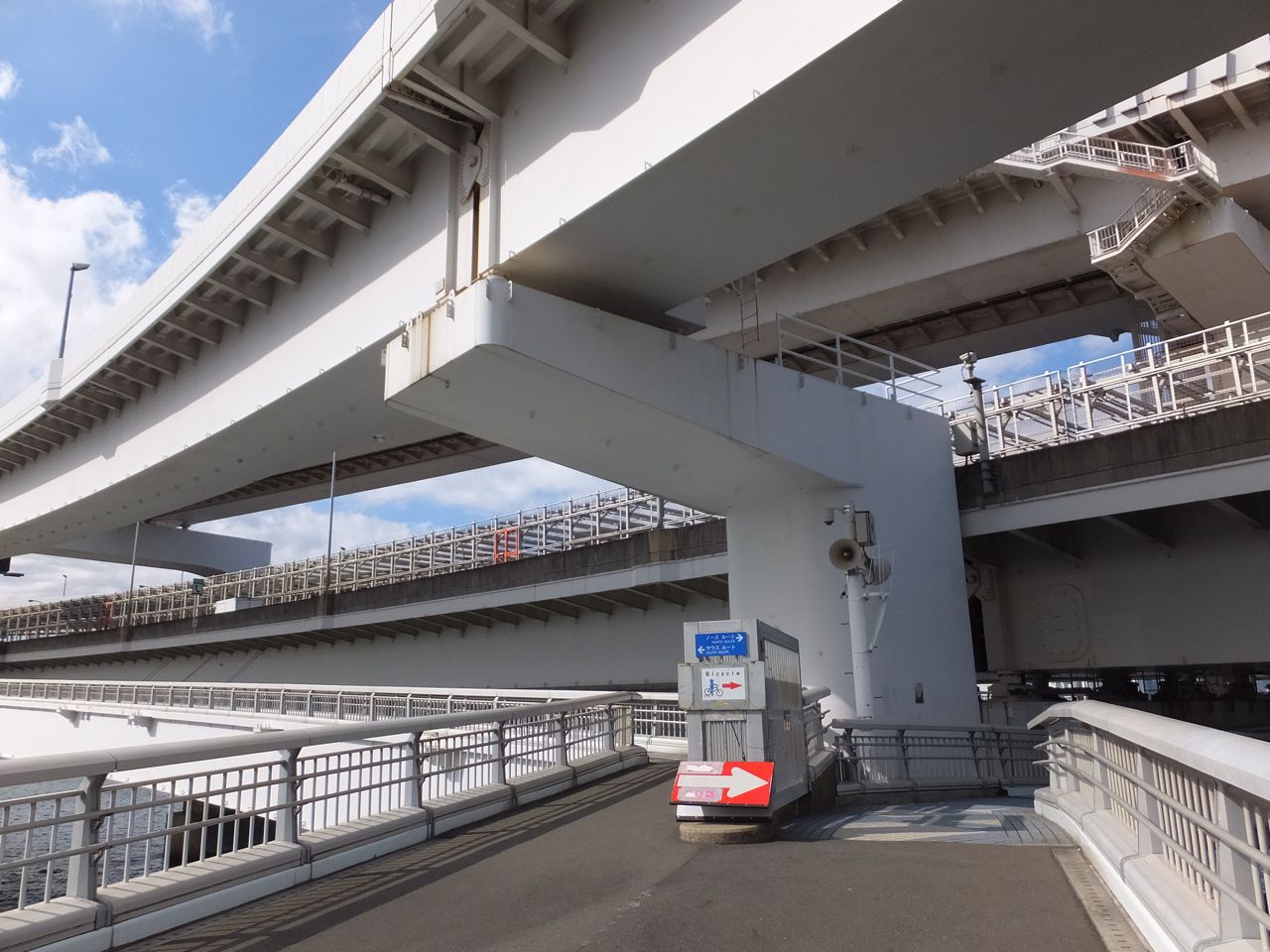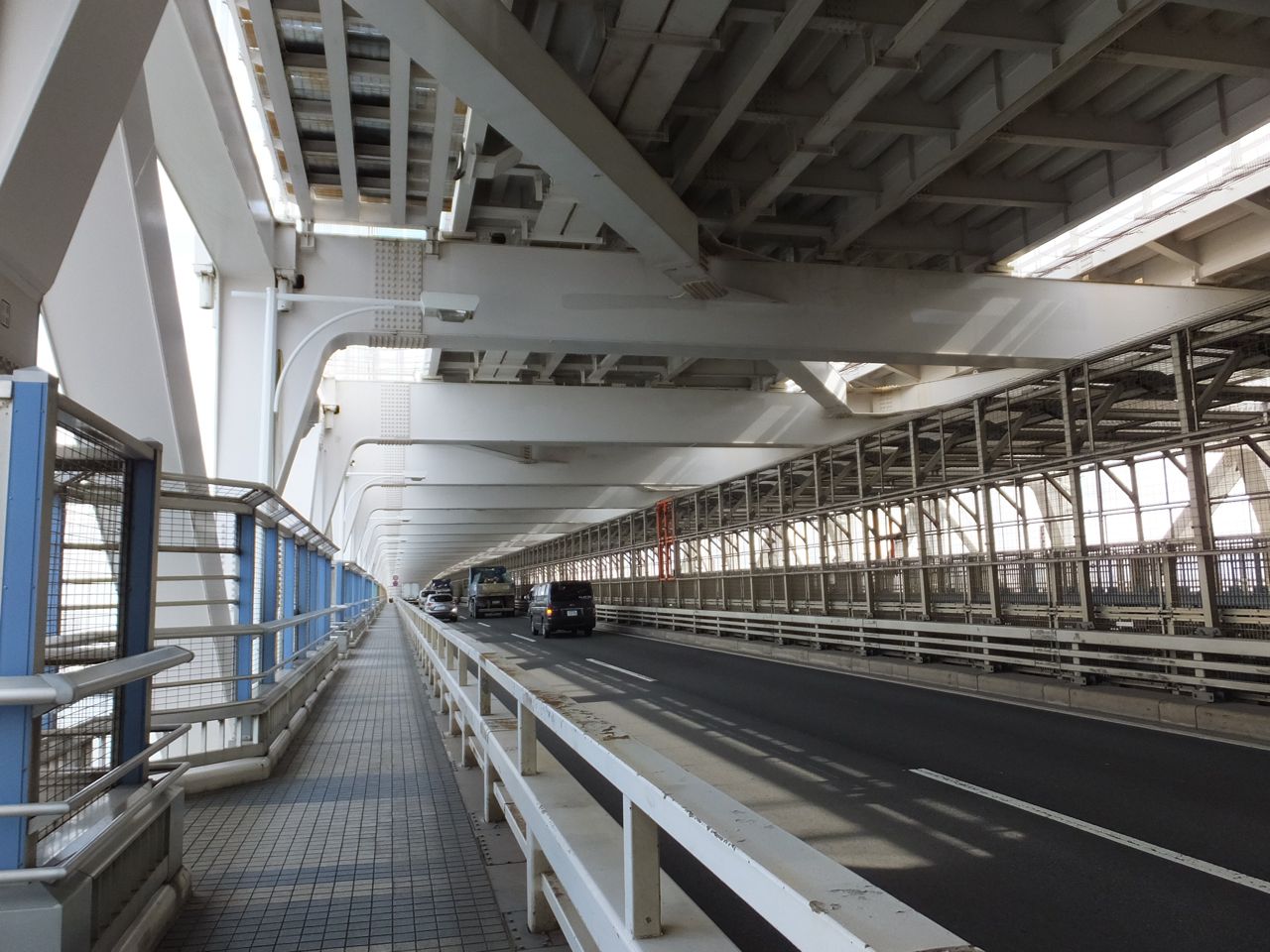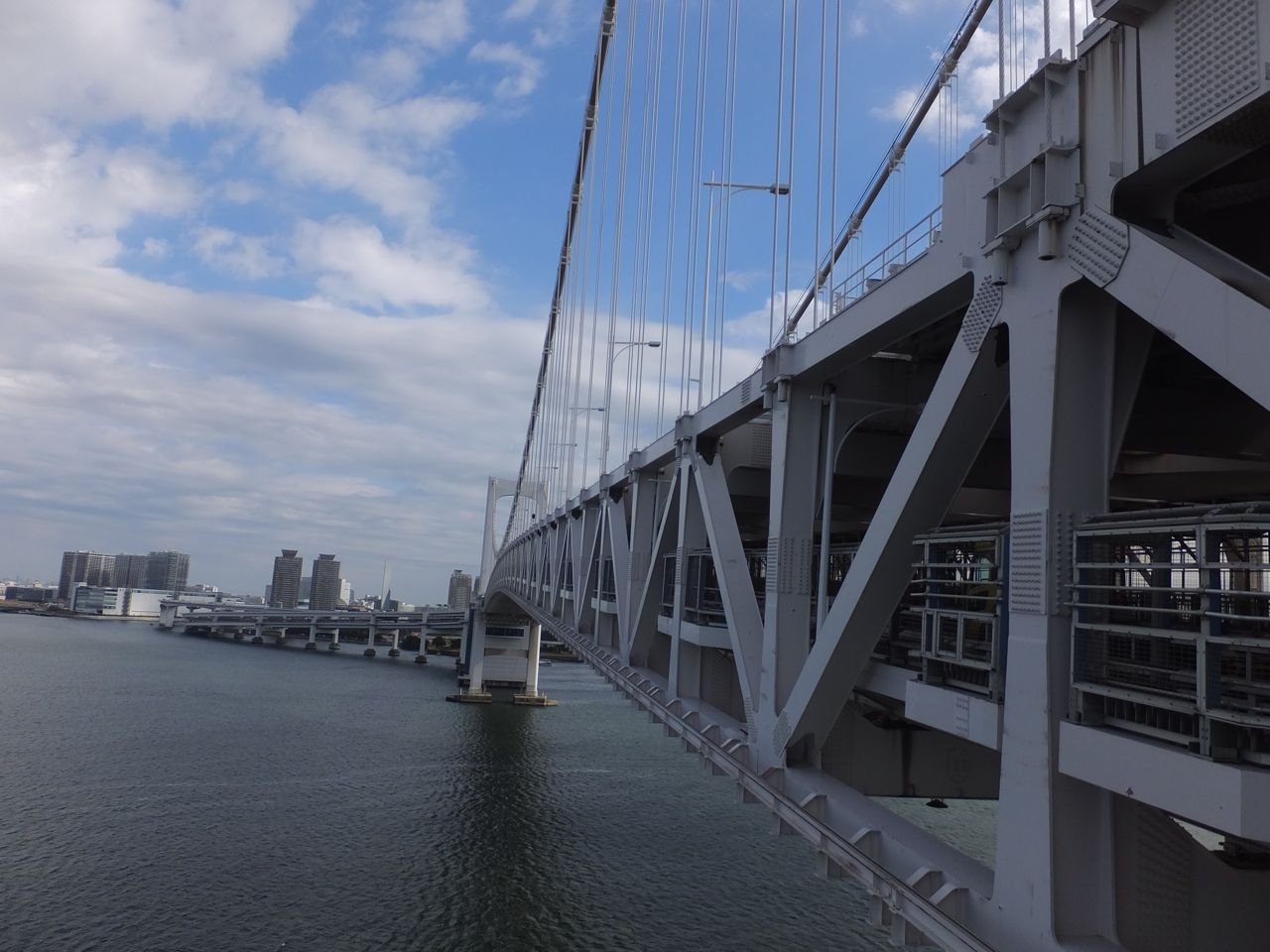 実は歩いて渡ることができます。ただアクセスがいまいちで、田町駅から20分くらい歩きます。また出口側のお台場の方もお台場海浜公園駅まで10分くらいかかります。橋を渡る時間の20分とエレベータ等の5分を併せると1時間以上かかるので注意が必要です。さすがに眺めがよく都心方向は河口と、その向こうのビル群、海側は東京湾がきれいに見えます。ただ、海側と陸側の通路の乗り移りはできないの登る時点で決めておかねばなりません。もちろん往復歩けばいいだけのことではあるのですが。