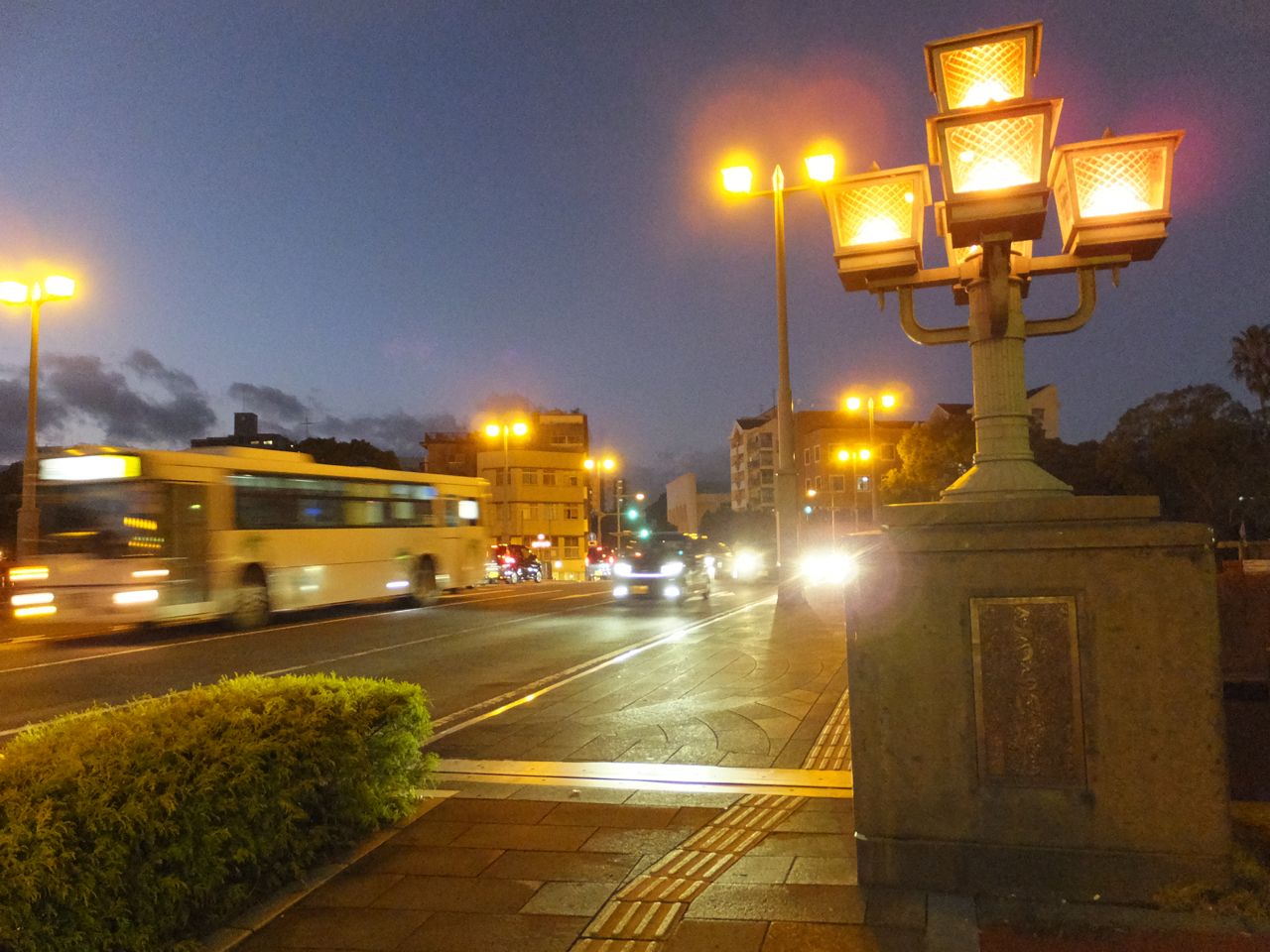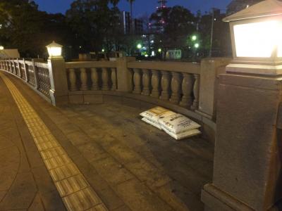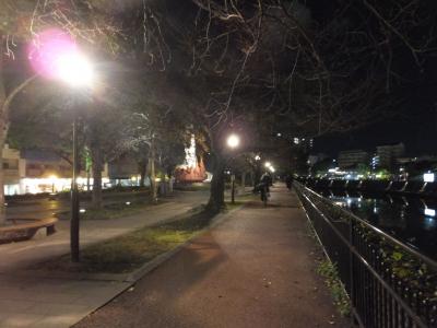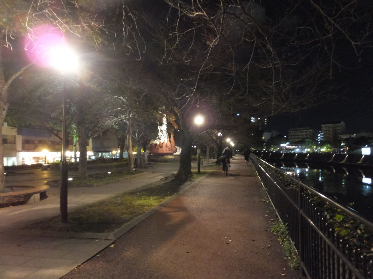 幅は10m以上ある緑地というか公園がずっと続いています。高見橋から高麗橋の間はいろんな碑やオブジェのある歴史ロードと名のついた一帯で散歩にももってこいです。上記区間内は夜でも明るくきれいでした。- 旅行時期
