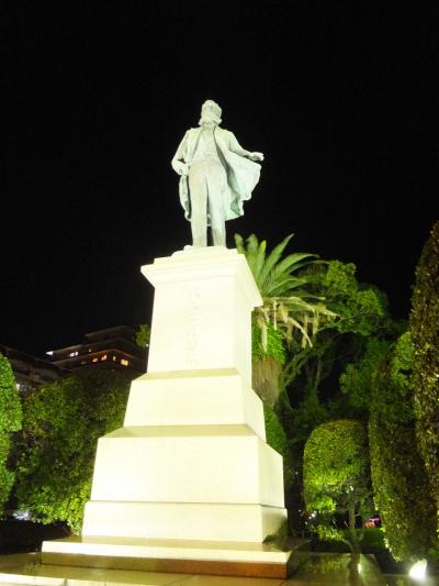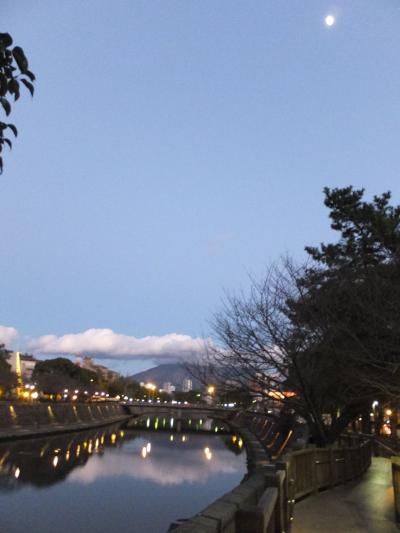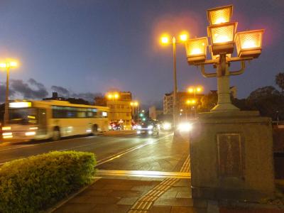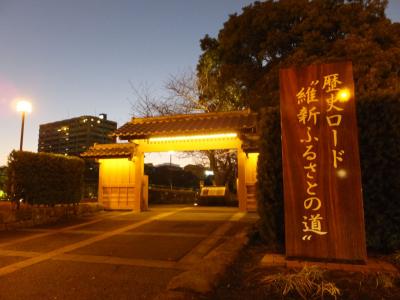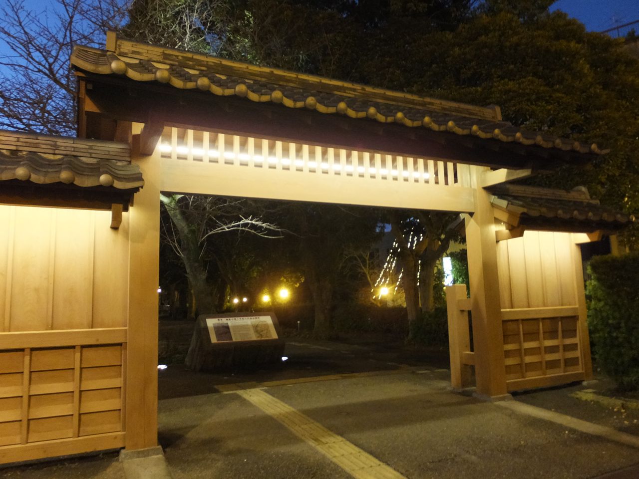 甲突川の左岸、高麗橋の上流に大きな門があって、そこからいろいろ幕末からの歴史を味わえるようなモニュメントや復元家屋などが並んでいます。有料施設かと思わせるような立派な門でしたが普通の散歩道の入口、というだけでした。最初に現れた「いろはうた」の展示がライトが中から照らしていろは歌が書かれたアクリルを照らし、とってもきれい。歴史を考えるかどうかは別にしても、夕刻の散歩道にしてとってもきれいです。