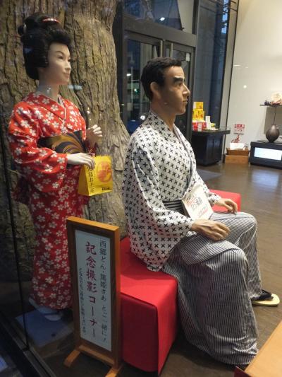 鹿児島中央駅のすぐ前で、通りに面して全面ガラス張りなのでめだってます。サツマイモのお菓子1本で勝負するかのような店名が潔いです。さて、店内でめだっていたのは西郷さんと篤姫の実物大?の人形です。記念撮影用ですので自由に並んで撮影できました。楽しい演出ですね。