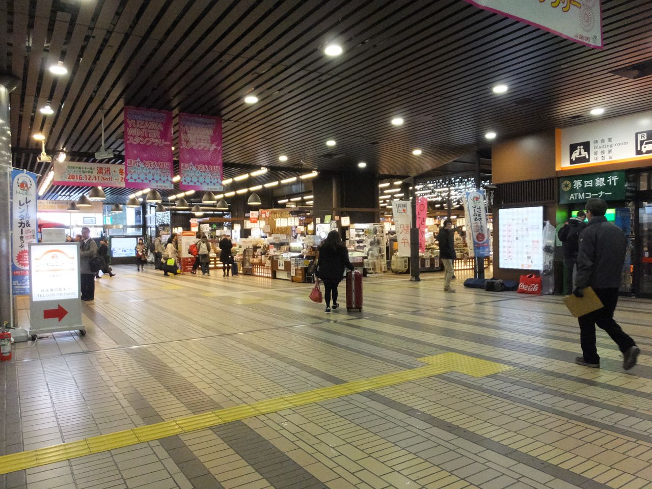 越後湯沢の駅の高架下、新幹線の改札口の目の前に広がるお土産もの屋さんの街並。左の端の1列はお食事どころです。右にはかなり大きな観光案内所。寒い駅の外に出ることなく、用事が全部すんでしまいます。