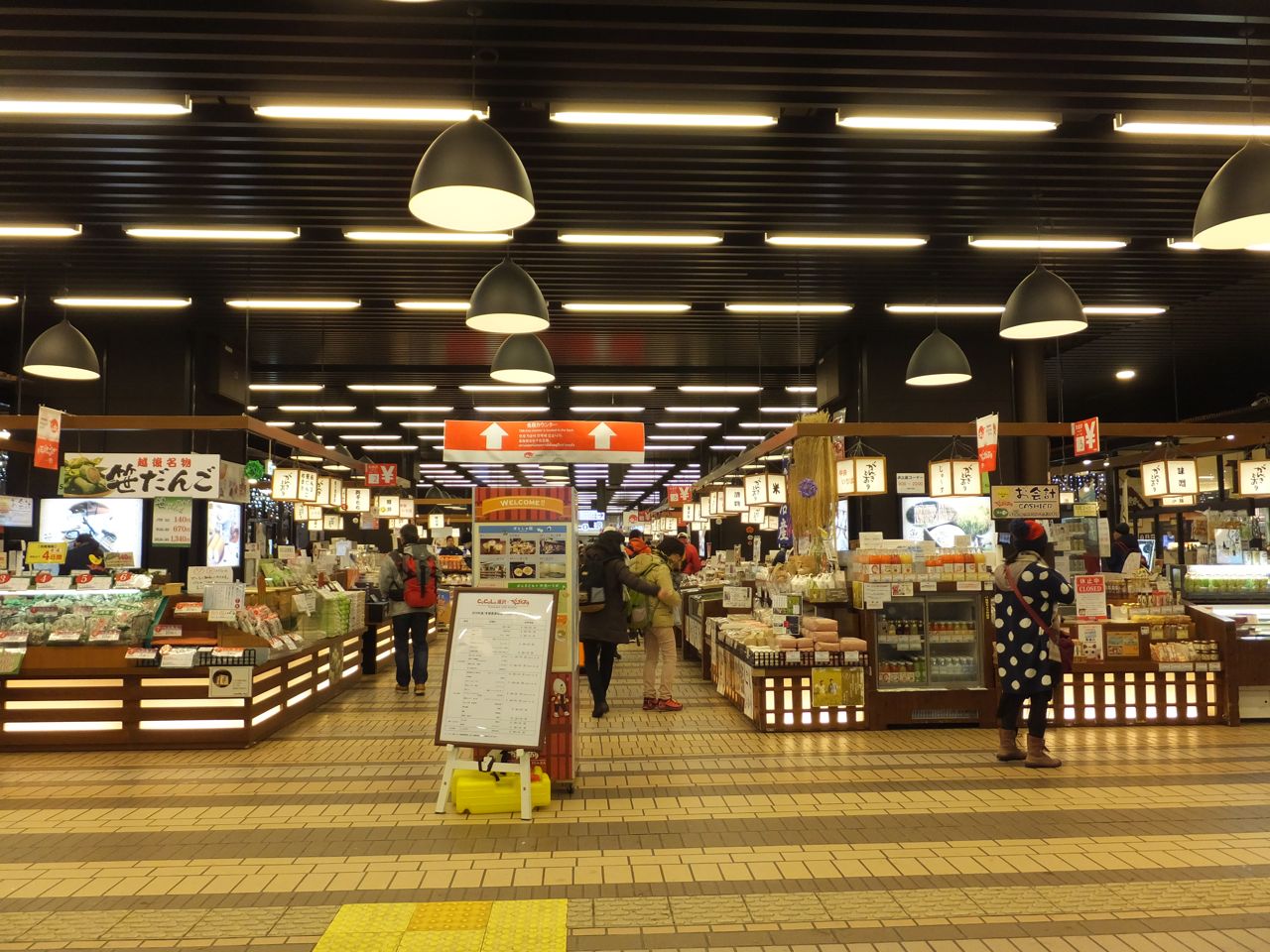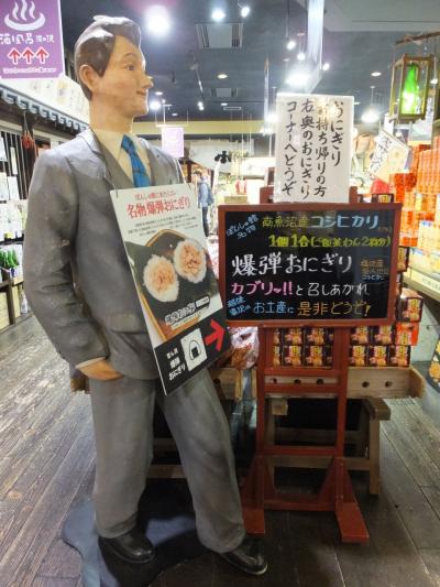 越後湯沢駅の高架下の改札口の目の前に広がるお土産物屋さんと食事どころと観光案内所の街並み。まさに雪国の「がんき」の下の商店街のように詰め込まれてます。新幹線の線路4本分とホーム分の幅に広がっているので2本、十分な広さの通路があり、回遊できるのはいいです。いろいろ比べることができます。