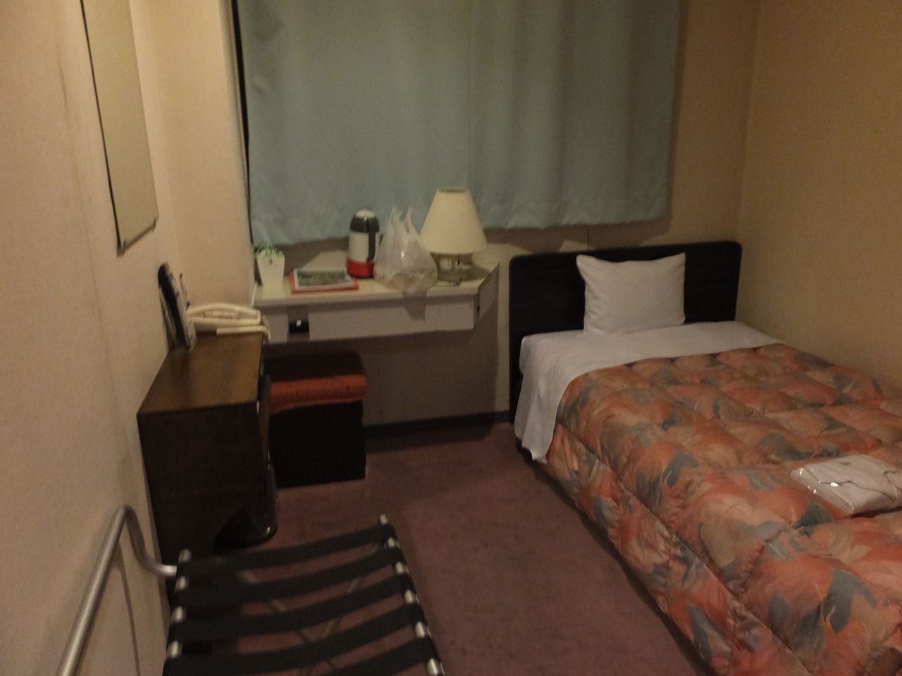 さて、市内でも安い方から数えてヒトケタのホテル。雨でもアーケードのおかげで傘をほとんどさすことなく到着。部屋には冷蔵庫と電気湯沸かしがないことがわかりました。最近リニューアルした高価な部屋にはあるようです。部屋はごく普通です。