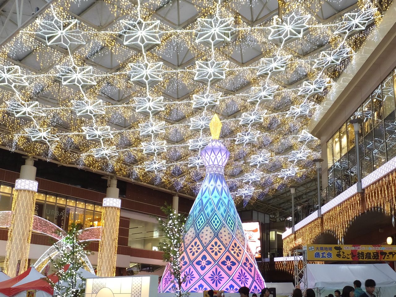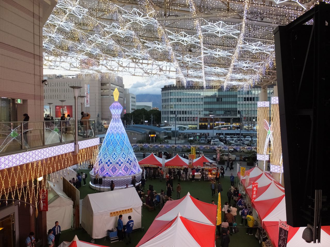 鹿児島中央駅の桜島の見える展望台の下の広場にクリスマスツリー型のイルミネーション。そして広場の天井には星模様のイルミネーション。広場から見てもきれいですし、上から見てもきれいです。ただ、広場は鹿児島県の物産市のようで、人でごったがえしていて落ち着いて鑑賞する、という感じではなく、にぎわいの演出のひとつのような感じと思われました。
