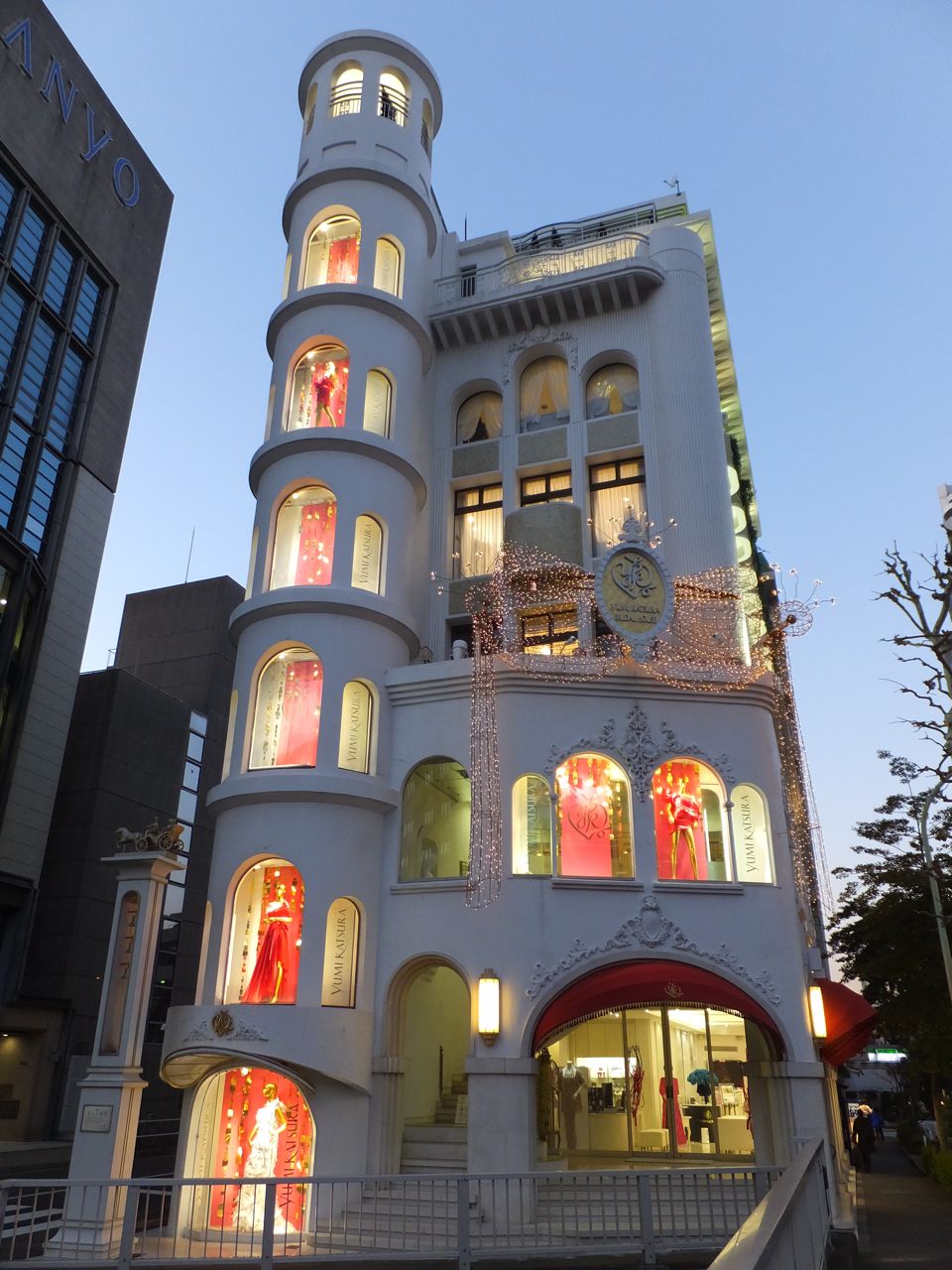 六本木から千駄ヶ谷に向かってあるくとき乃木坂駅の先にあったなんともメルヘンなお城のような館のような建物。窓毎にドレスが展示してあって窓毎にYUMI KATURAと書いてあったのでああ、ブライダルのお店だな、とわかりました。それぐらい有名なデザイナーですよね。白のビルに赤の装飾でほんとうにめでたさ満載。見るだけで楽しいビルはめずらしいです。夢を売る、というのがどういうことかちょっとわかった気がしました。