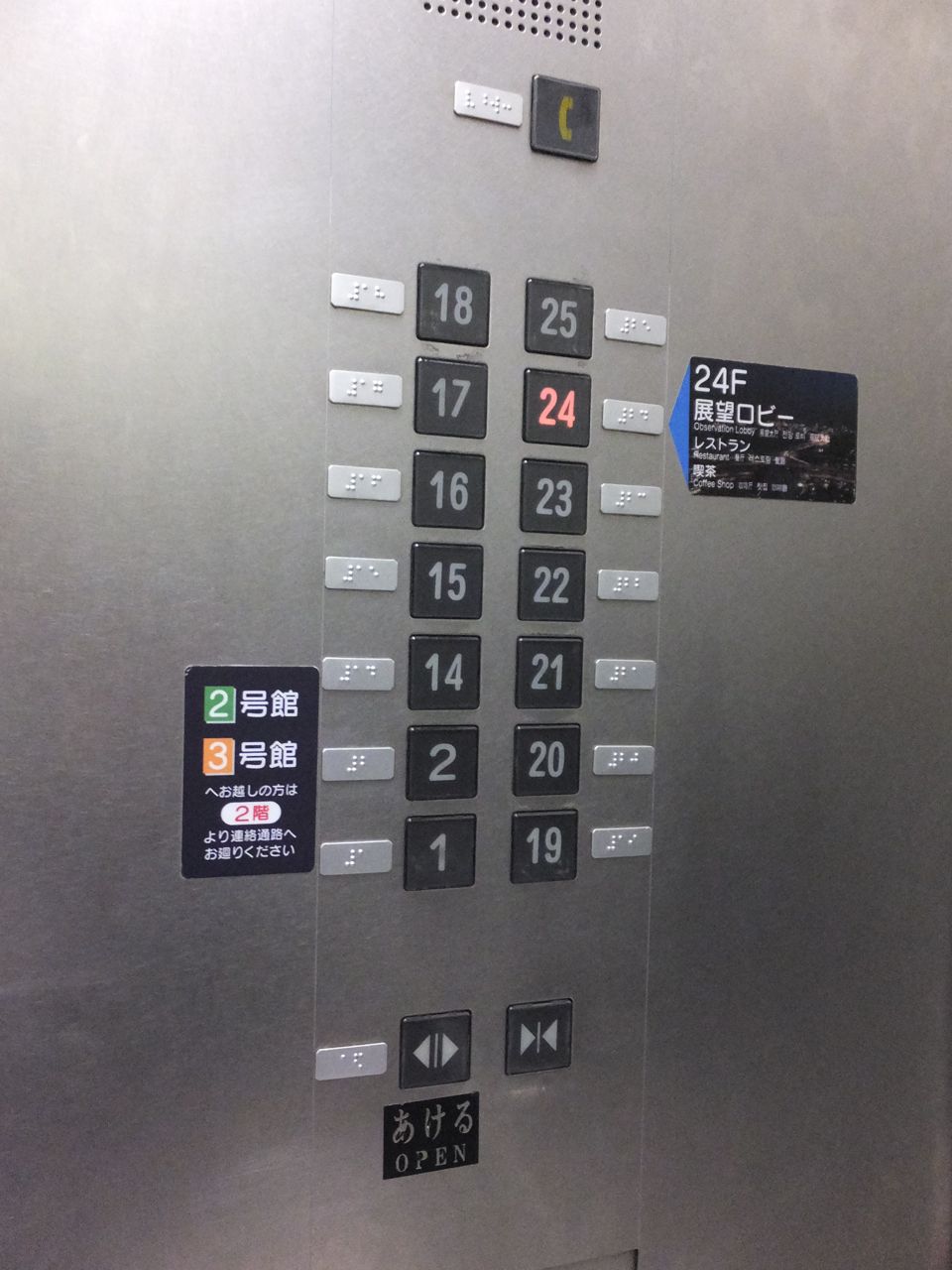 直行エレベータで24階へ。市役所の1フロアの全方向が無料の展望台です。土曜日の夜でも開館していました。利用客は少なく、ゆったりと見ることができました。警備員がいるので治安面も安心です。