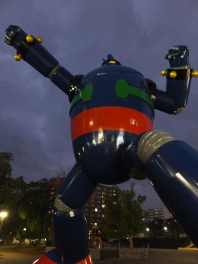 神戸復興のシンボルともいえる鉄人28号。そのモニュメントを訪ねるため新長田駅で降りたのですが、駅前の地図・案内板にも案内はなく、矢印などもなくどこにあるのかさっぱりわかりません。商店街に鉄人28号の顔の板が見えたのでそっちだろうと行くと、ありました。駅の南口を出て右側のビルの中を通り抜ければすぐだったのを遠回りしてしまいました。場所としては駅の南の西に向かった線路沿いです。