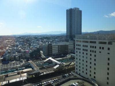 京王プラザホテル八王子の最上階のレストランフロア。南側にあります。八王子の駅を見下ろし、丹沢の山々をバックに八王子近郊の丘陵を眺める絶好の展望です。ぜひとも早期予約で窓際をおさえたいものです。
