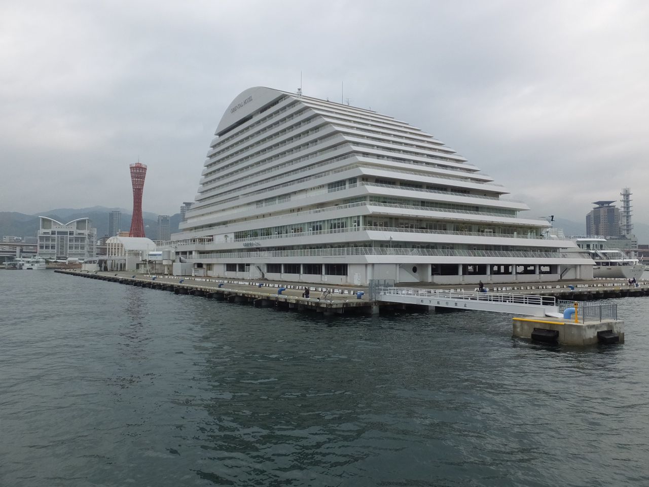 神戸港のメリケンパークにあるならだかなカーブのシルエットのホテル。クルーズ客船にも似ています。