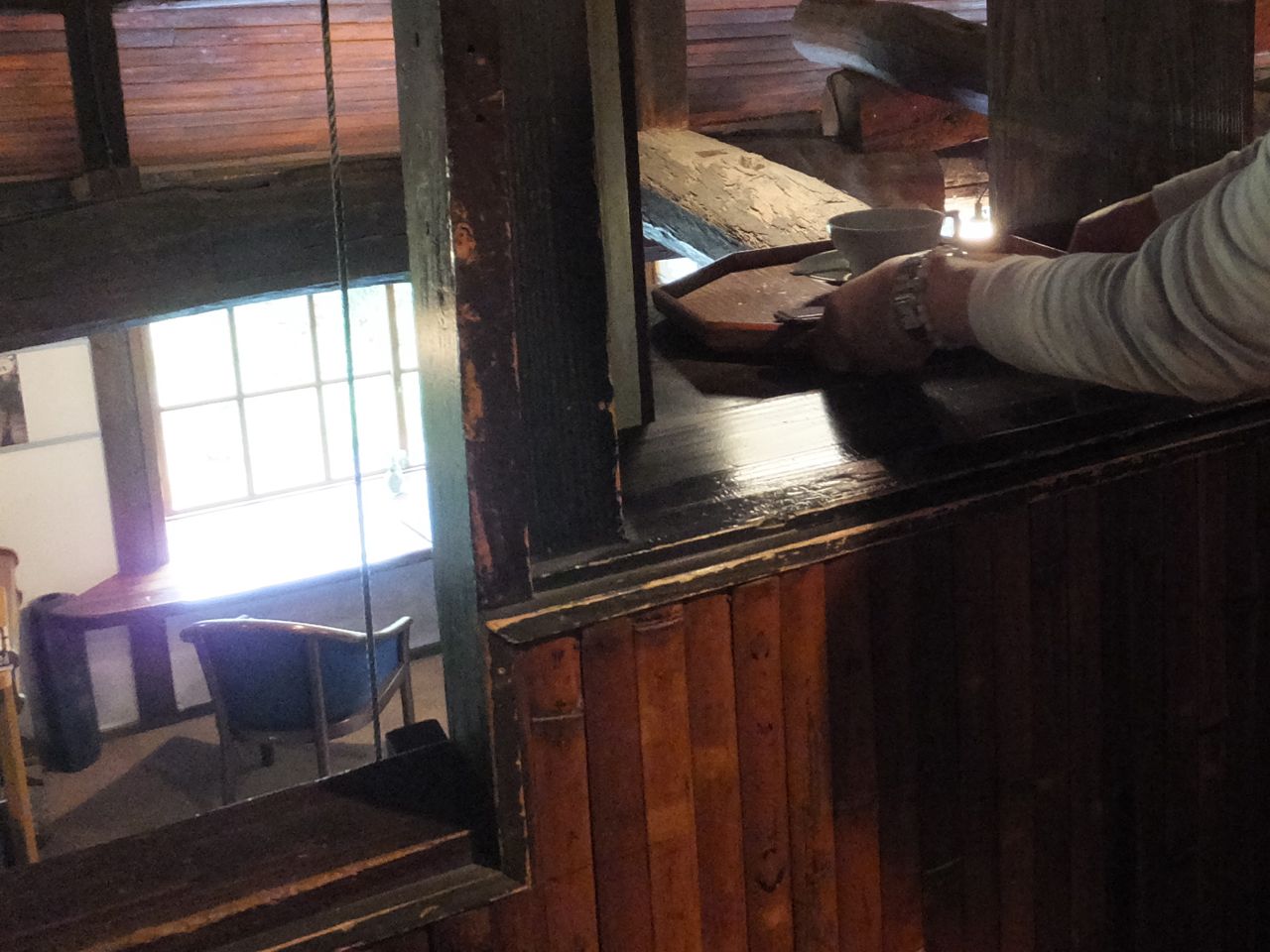 この席は特別なのです。目の前にお食事運搬用の手動のエレベータがあってお料理がこれで運ばれてくるのです。その席はこの1テーブルのみ。