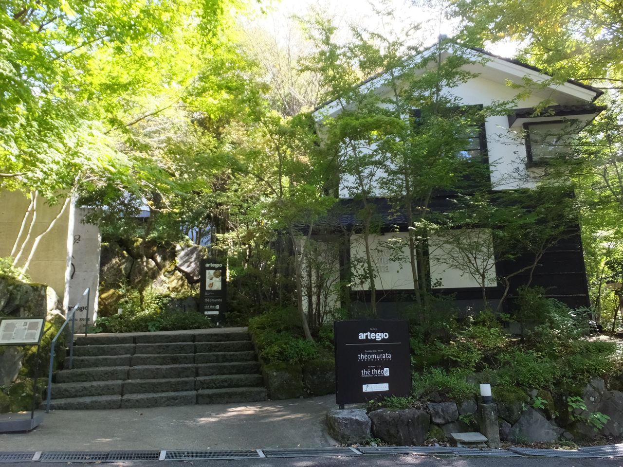 由布院御三家をまわりました。このムラタ(無量塔)のカフェと売店はちょっとわかりにくいところにあり、細い道をどんどん上がっていったどんずまりは旅館で、そこにクルマをとめ、階段を下りて美術館の脇から入ったところでした。