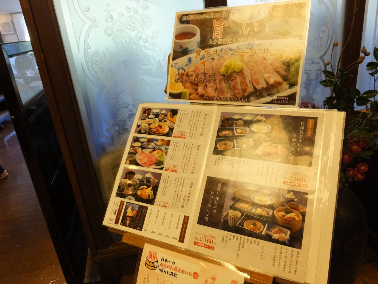 丼といいながら細長い舟形の焼き物に入ってきますので丼にみえず、おしゃれ。それに3品ほどつくので卓上もにぎやか。ステーキは柔らかくて美味しかった。(窓側ではなかったですが)由布院の街の遠望と由布岳の遠望とで眺望もいいです。