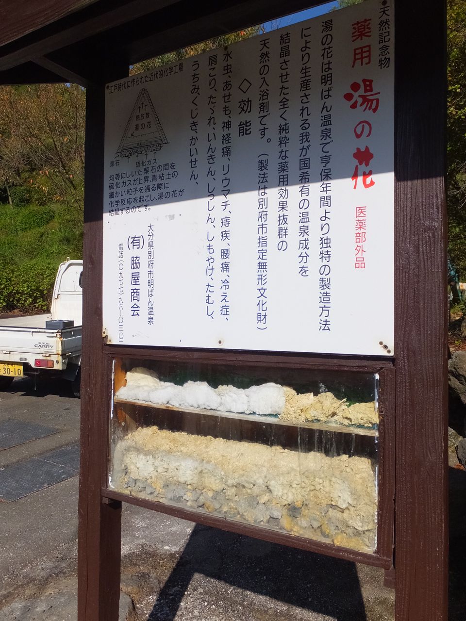 案内解説板を読んで、湯の花の成長は1mm/日であること、40日程度で粘土の活性が落ちるので取り替える必要があることなどがわかり、温泉水から勝手に析出するのを集めただけじゃないんだなあ、と感心しました。- 旅行時期