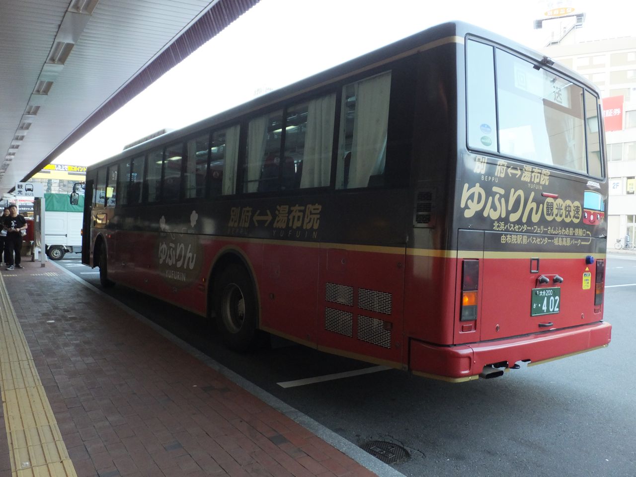 由布院と別府は鉄道だと大分市を廻って四角形の3辺を行くおおまわりですがバスならショートカット。そのバスがこの快速「ゆふりん」。1時間おきくらい(でもなぜか20分~90分おきと不等間隔)で、前方扉のみの簡略観光タイプの車両の専用ラッピング車です。別府の一日乗車券は900円ですが、1600円で由布院まで乗り放題になるのでお得です。なにせ片道900円ですから往復するだけでお得です。まあ、日帰りなら、ですが。