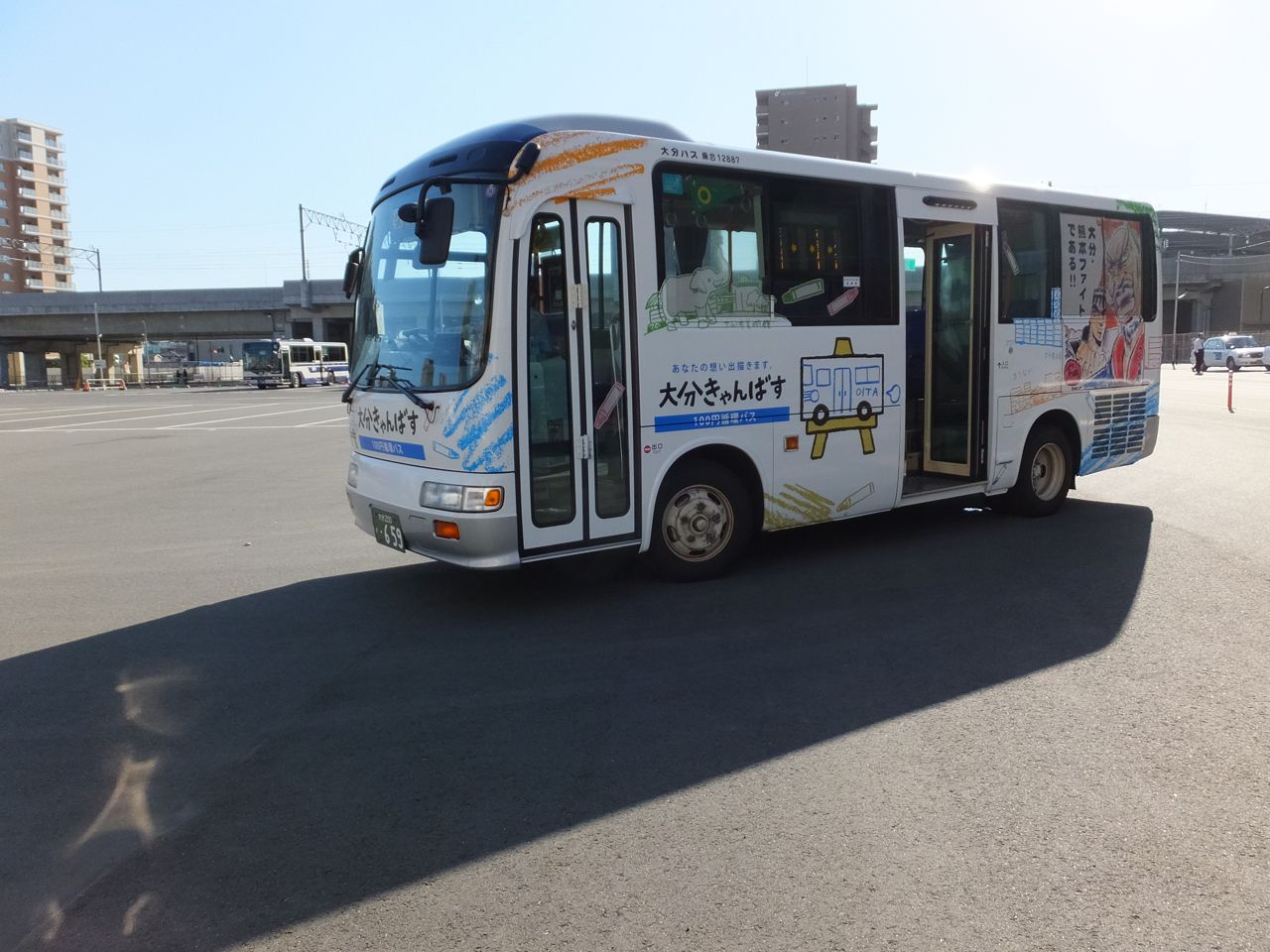 大分市は県庁所在地ですが100円のかなり広い範囲をめぐるコミュニティバスが運行されています。昼間は約30分ごとです。要町という大分駅の裏の駐車場の外れが始発終着ですがきちんと駅前のロータリーのバス停にも寄ります。市街地と駅を結ぶ交通手段として、また市街地のちょっとした観光地を巡る際には安上がりにすますことができます。大分市の委託事業なのか大分交通と共通の運行のようです。