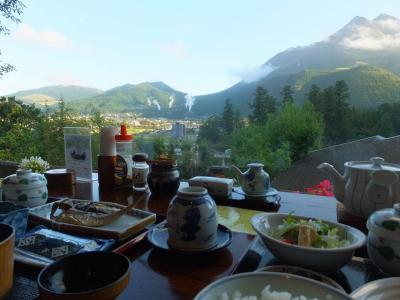 朝食は由布院の盆地を遠望するすばらしい景色を見ながら。