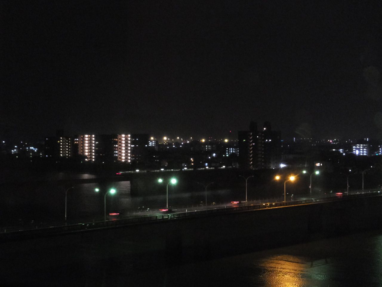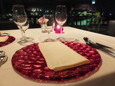 夕食はフレンチレストラン。窓の外は大淀川で川に映った灯りがきれいです。