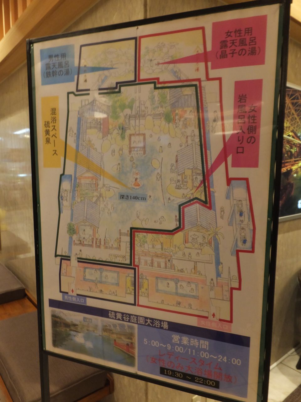 いちばんの売りの大浴場は混浴で、夜のみ女性専用に。けっこう男性に混じって女性も入ってました。浴槽は深いので歩くのもちょっとかがめば首だけになりますし、女性専用ゾーンもちょっとだけありました。