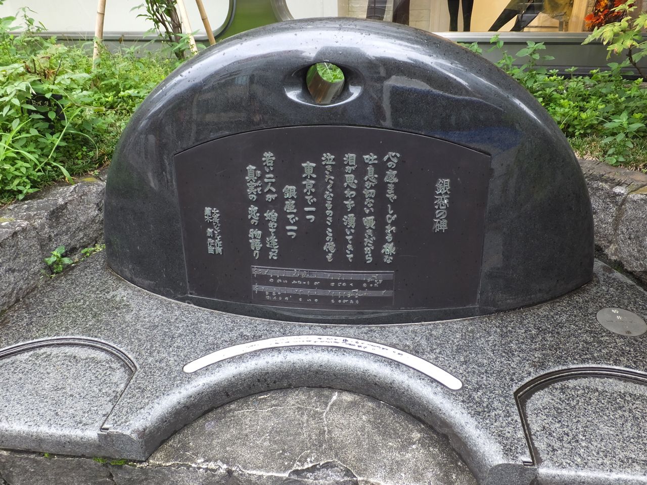 この曲が流行した時代は遠くなったのですが、上の世代の方々とカラオケなどでよく聞く曲だと思います。デュエットの名曲で250万枚もレコードが売れたのでそれを記念して銀座に建てた碑なのだそうです。建ったのは平成2年なのでそう昔ではありません。やはり曲の残した印象が深くて、評価が高いまま固まった曲だとこのように碑が建って、あとの世代まで広く知られるようになるのだなあ、と感慨にふけってしまいました。やはり歌っていた歌手の方にとっては、とても嬉しいことでしょう。