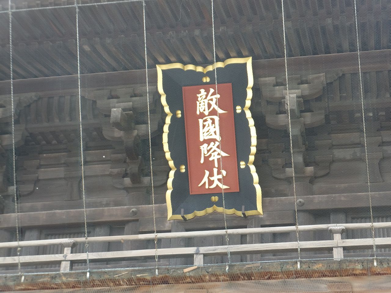 さて、この筥崎宮の一番驚いたのはその好戦的な額。楼門の上に輝く額には「敵国降伏」の4文字。いったいいつの時代のものかと思ったら鎌倉時代の元寇のときのものでした。そのときの蒙古船のイカリの重り石の展示などもあります。