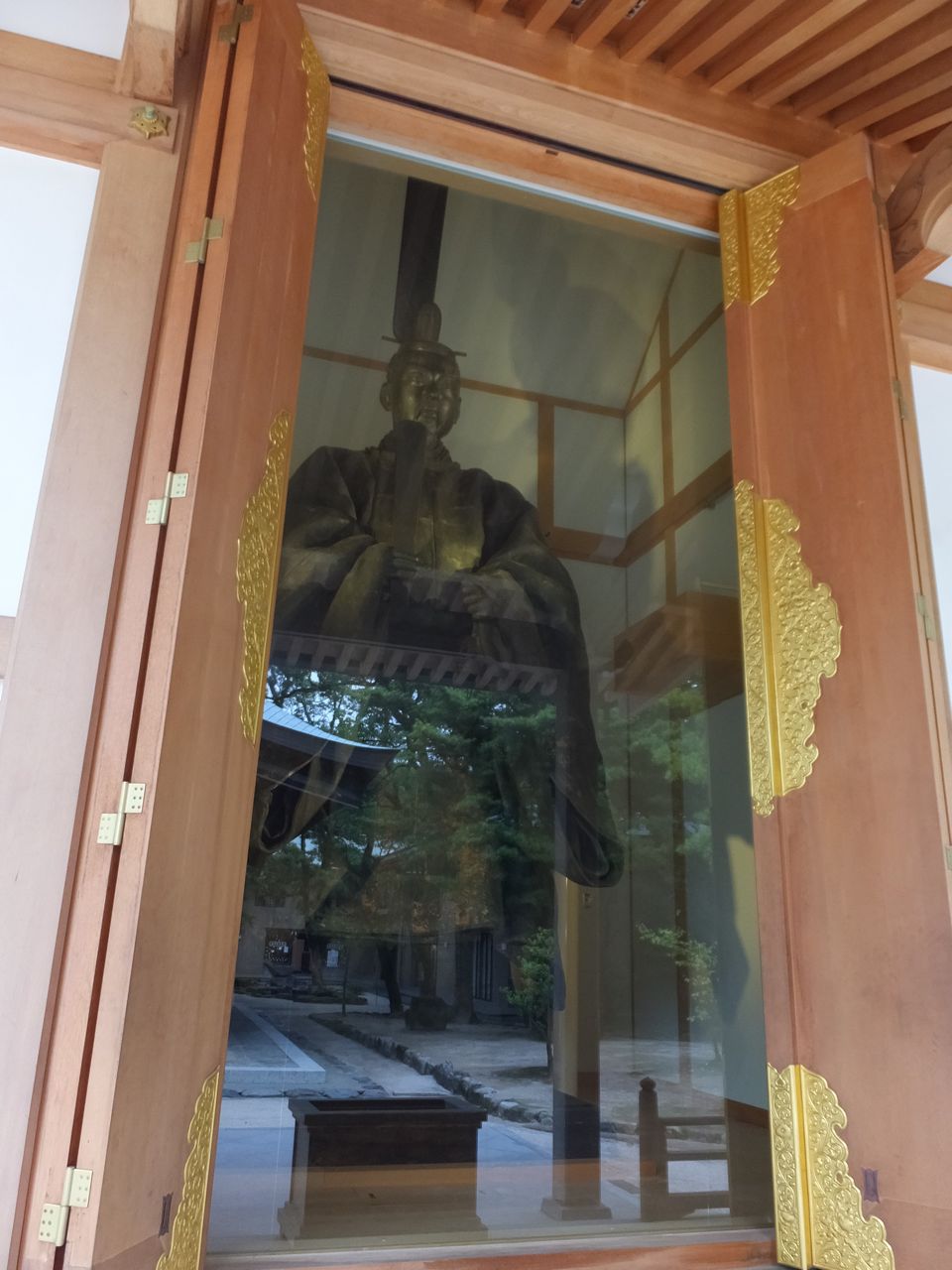 筥崎宮の境内で真新しい、でもやや小さな建物がありましたが、中を覗くと巨大な像が高さぎりぎりいっぱいに収まっていました。元寇のときの上皇、亀山上皇の立像でした。普通、像と言うのは等身大のことが多いのですが(そして台座に乗って高いところにある)、この像はそれ自体が人の身長の4倍くらいありそうです。