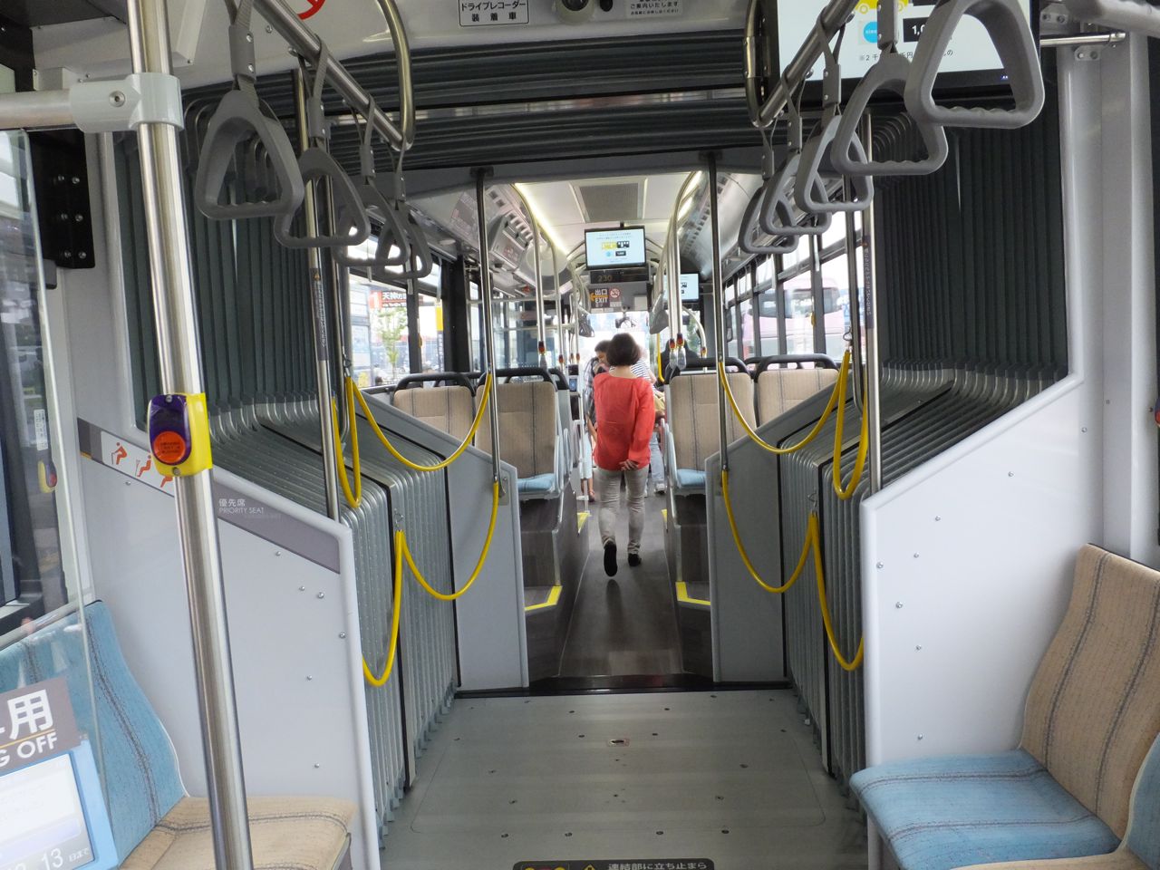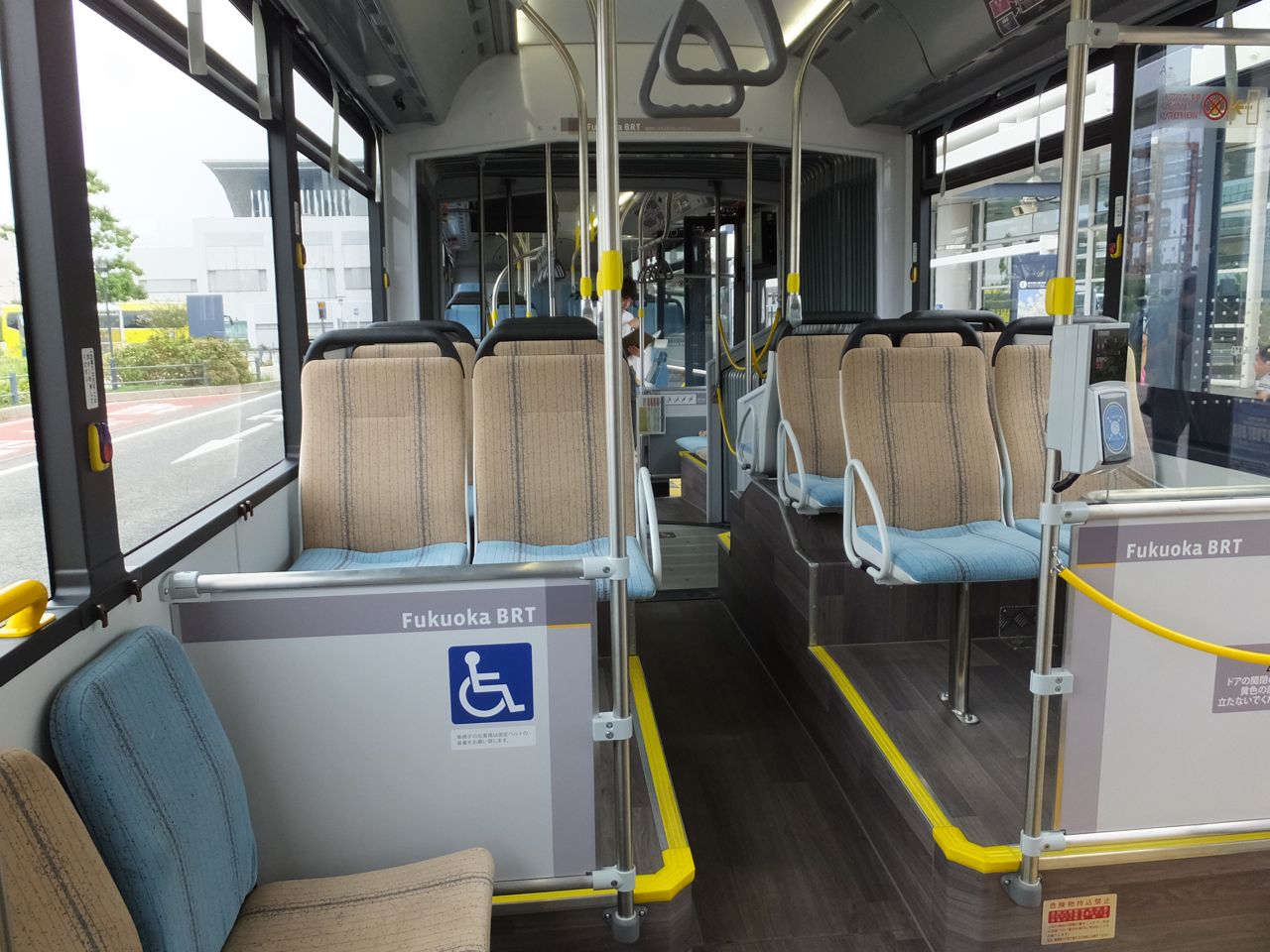 福岡市では博多港と市内の連絡に連節バス(連接、でもいいようです)を運行しています。博多駅から乗車しましたが、直前に出た博多港行きが超満員だったのに、知られていないこの連節バスはがらがらでした。もうちょっと宣伝が必要かなあ、と思います。走っている姿はインパクト大なのですが。