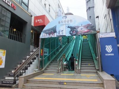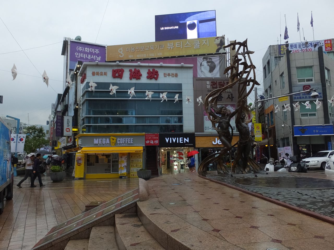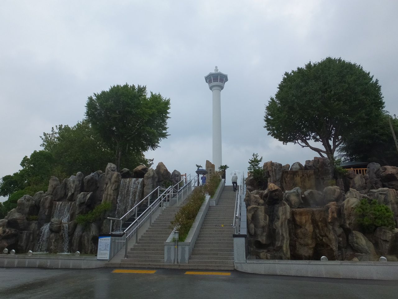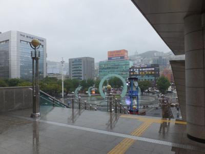 町の顔としての釜山駅は立派で大きく、その駅前も広く立派です。やはり中央駅はこうではなければ、という存在感がいいです。駅舎の大きさにみあうような大きなモニュメントも印象的。ただちょっと無機質、かも。人がゆっくり休む公園ではないです。駅の入口の階段の上から全景を眺めると全容がわかりますのでちょっと立ち止まってみてみましょう。公園の背後の街並とそのむこうの山が見えて釜山の地勢がちょっと理解できます。
