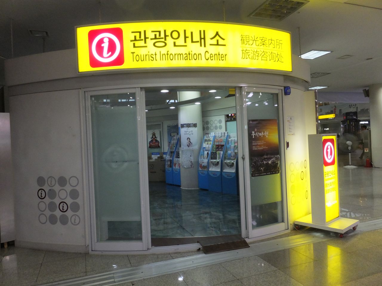 釜山駅の改札口を出たホールの中にあります。日本の普通の観光案内所があとからとってつけたように駅の外とか壁きわのショップに埋もれて、と言う感じの場所が多いのに比べて、改札口から町に出る途中にきちんと眺められる場所にあるのはすばらしいです。しかも黄色の看板で目立っていました。日本語も大丈夫でしたので、町に出る前に観光パンフをもらうために是非寄ってみましょう。
