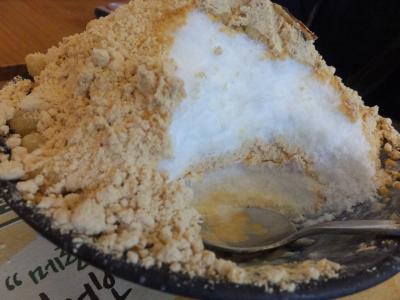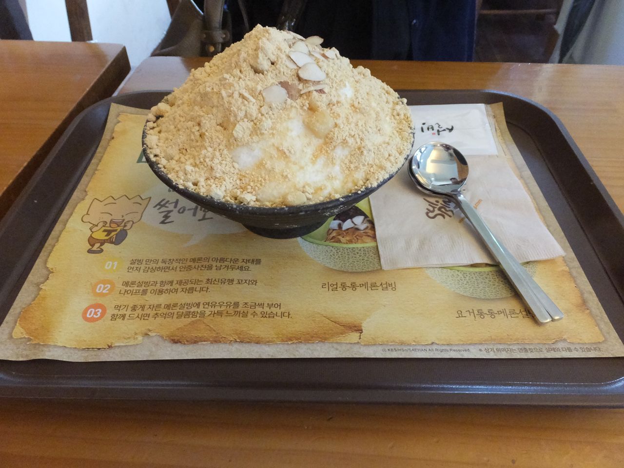 最初にカウンターで注文してできたら取りにいきます。メニューは苦労した想い出がないので英語は少なくともあったような。写真もありました。2人で一個にしました。やはり大きいです。きな粉が表面にかかって溶解防止になっている微細かき氷。ただ、半分くらい食べてから、他のテーブルの人がなにか掛けている、と気づくとカウンターから離れた場所にカップに小分けした練乳がテーブルに並べてあって、そこから持ってきているようです。案内はなく、といっても韓国語はわからなかったので仕方ないかも。