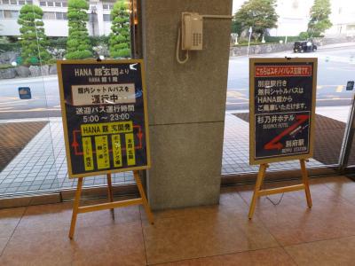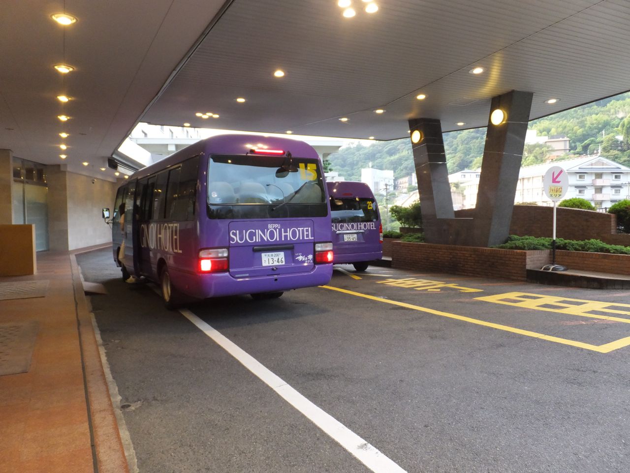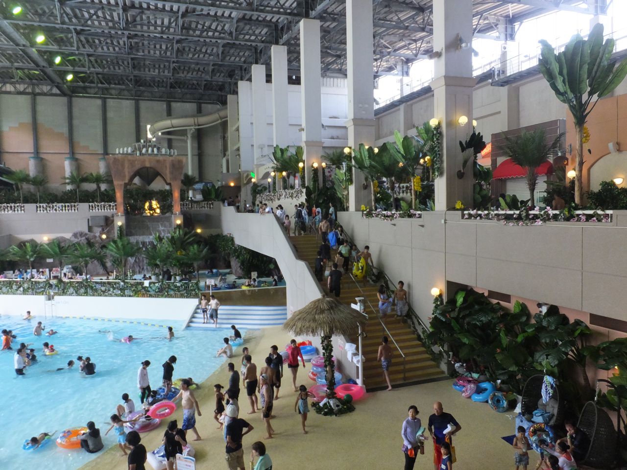 ともかく大きいです。建物は2つの中層のホテル棟に低層のホテル棟があいだにはさまり、プールと温泉が別にあって、端から端まで歩いたら10分はかかりそう。そのためまさに間断なく連絡バスが運行しています。それも定時制ではなく人が乗ったらすぐ動く感じです。いかにお客さんが多いかわかります。