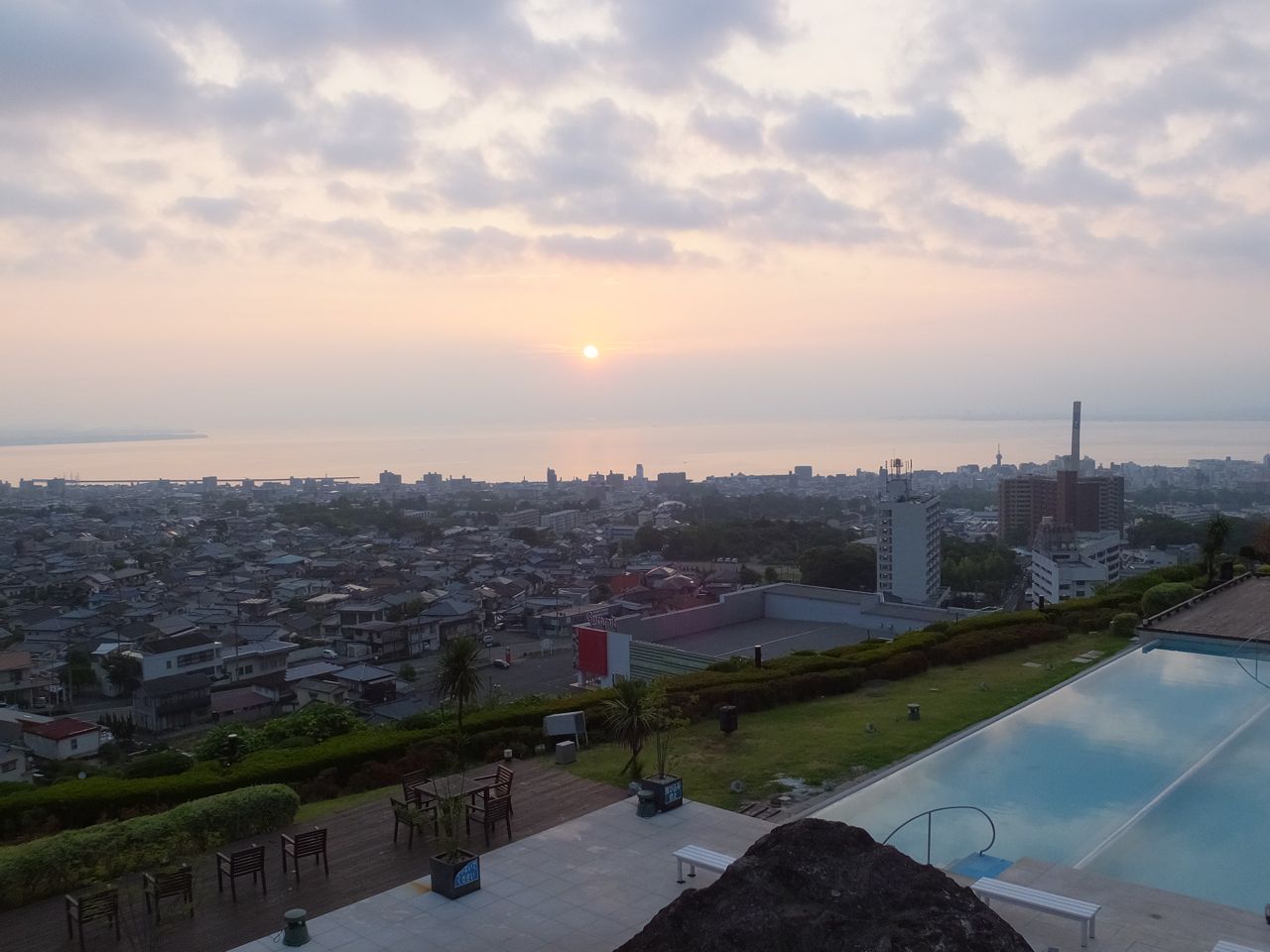 別府の町の上にあるサービスエリア。眺めはすばらしいです。手前は別府の街並。右手別府湾の向こう、高崎山の先の大分の町や工業地帯まで見えます。博多方面から来ると別府のインターで降りる手前なので、是非、展望のために寄ってみましょう。