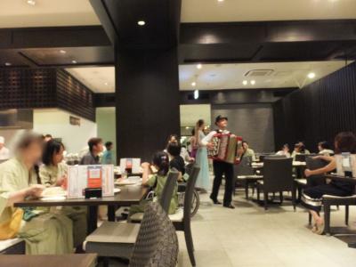 夕食のレストランはバイキングを選択。これまた広いし、料理は多いし、美味しいし。流しのバンド演奏も廻ってくるし、すばらしいです。
