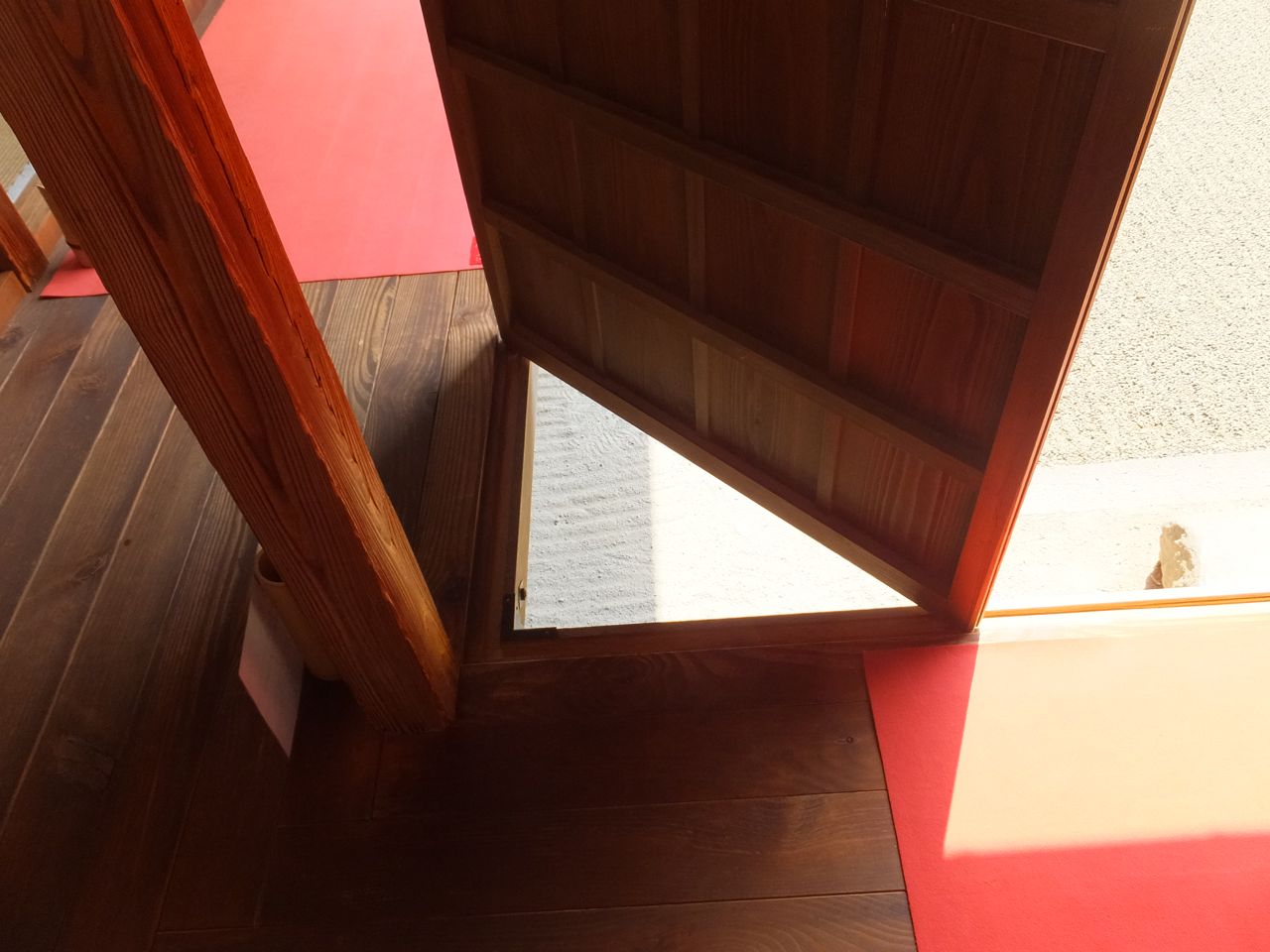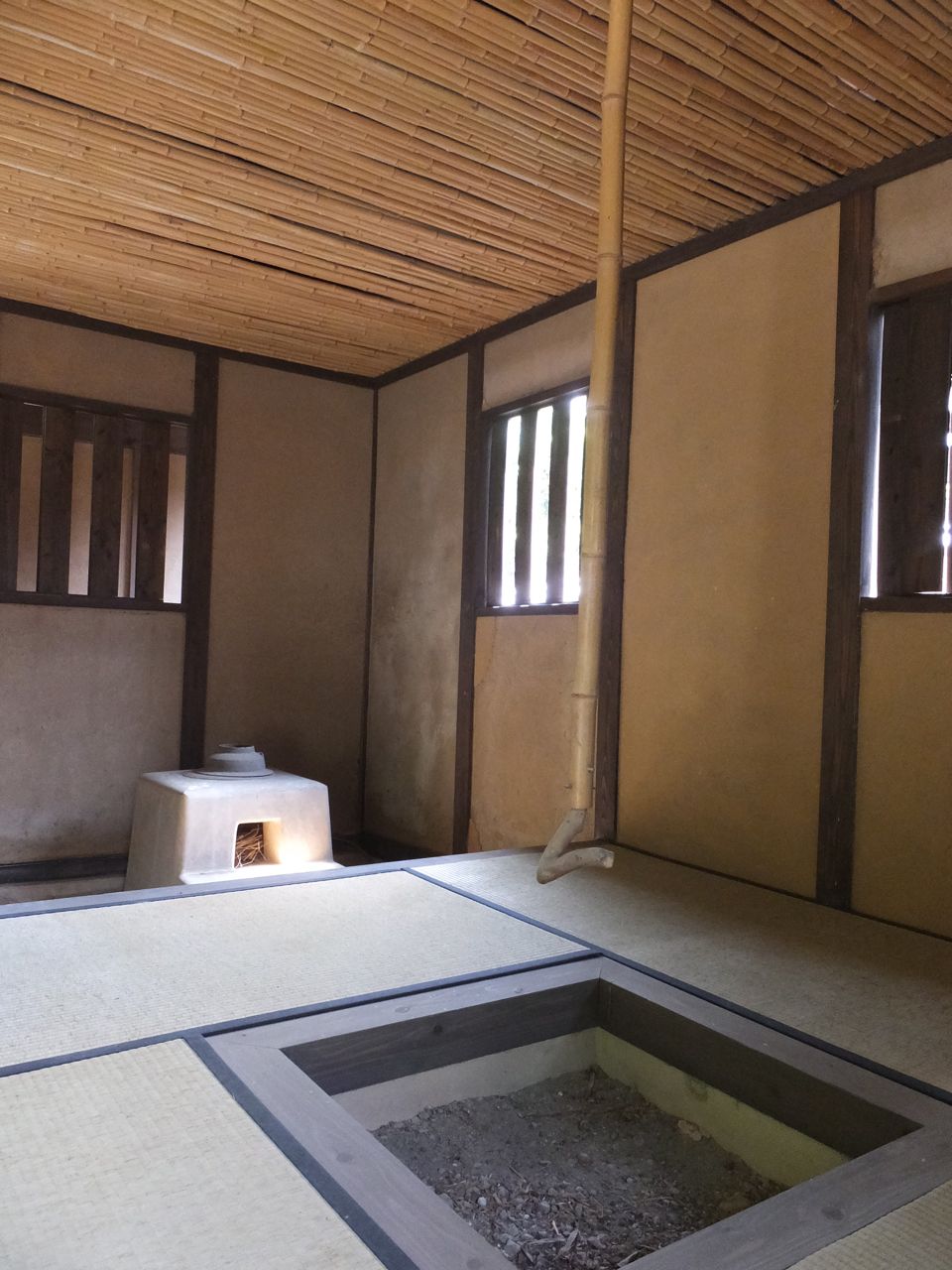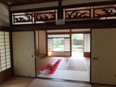 内部はなげしの透かし彫りがきれいだなあ、と感じました。それにいろいろ係員の方が解説してくれて、とくに雨戸の隅が直角に動くのが見事。おそらく庭をきれいに眺めたいために雨戸を片方にきれいに収めたいための工夫なのでしょう。