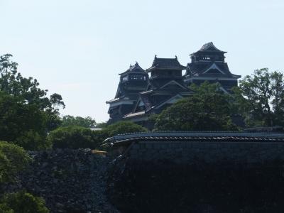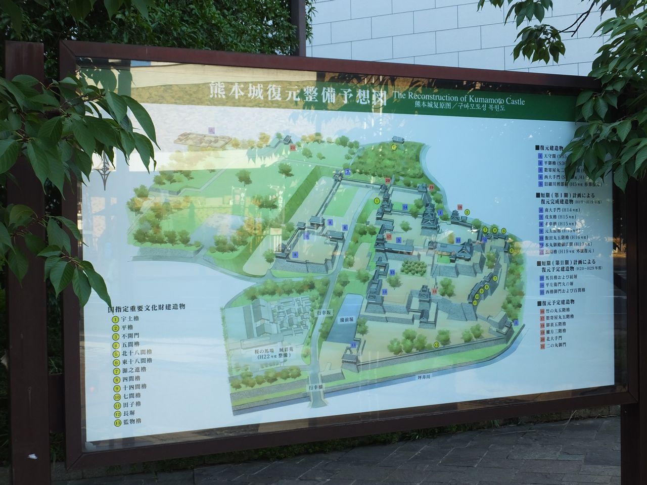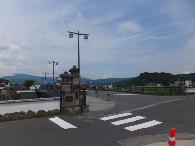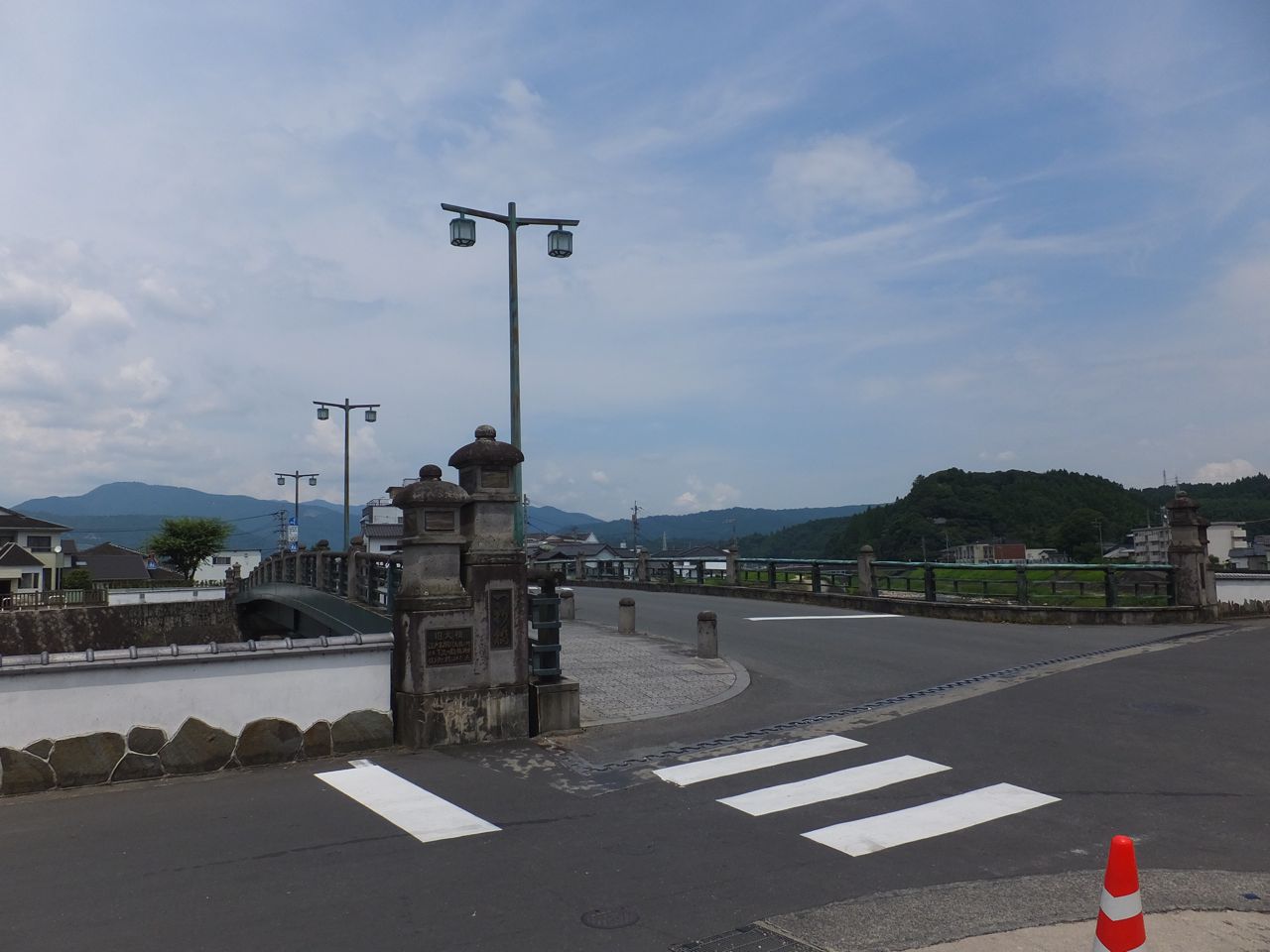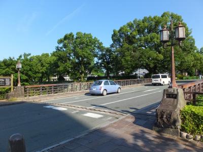 「行幸」というからには天皇家関係の橋、です。1902年に明治天皇が熊本城に訪れるときにここに架かっていた木製の「下馬橋」(ここから馬を降りて歩きなさい、ということでしょうね)の代わりに馬車が通れるような立派な橋を架けたのだそう。そういえば立派な街灯が。その先の急坂もなだらかな坂にした由。馬車が逆走でもしたら困りますものね。現在は橋を渡ったら左折、桜の馬場「城彩苑」という商業施設の集まった観光スポットに行くだけの道になっています。なんとなく接続部が盛り上がっているような。そして間隔があいているような気がします。地震の影響かもしれません。もちろん安全に通行できます。