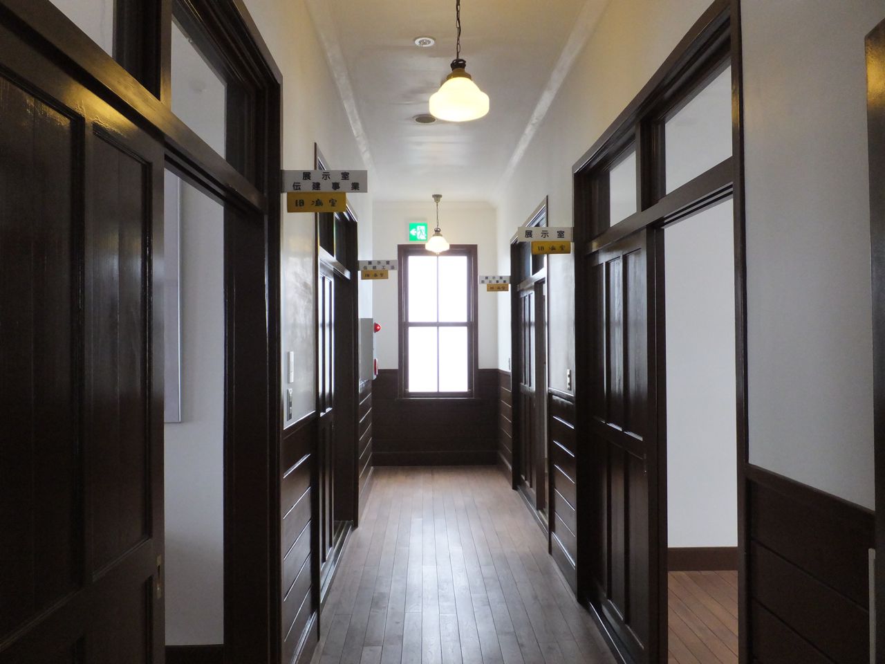 板張りの廊下、下半分板張りの廊下、真っ白の天井もきれい。レトロな洋館建築好きには堪えられません。