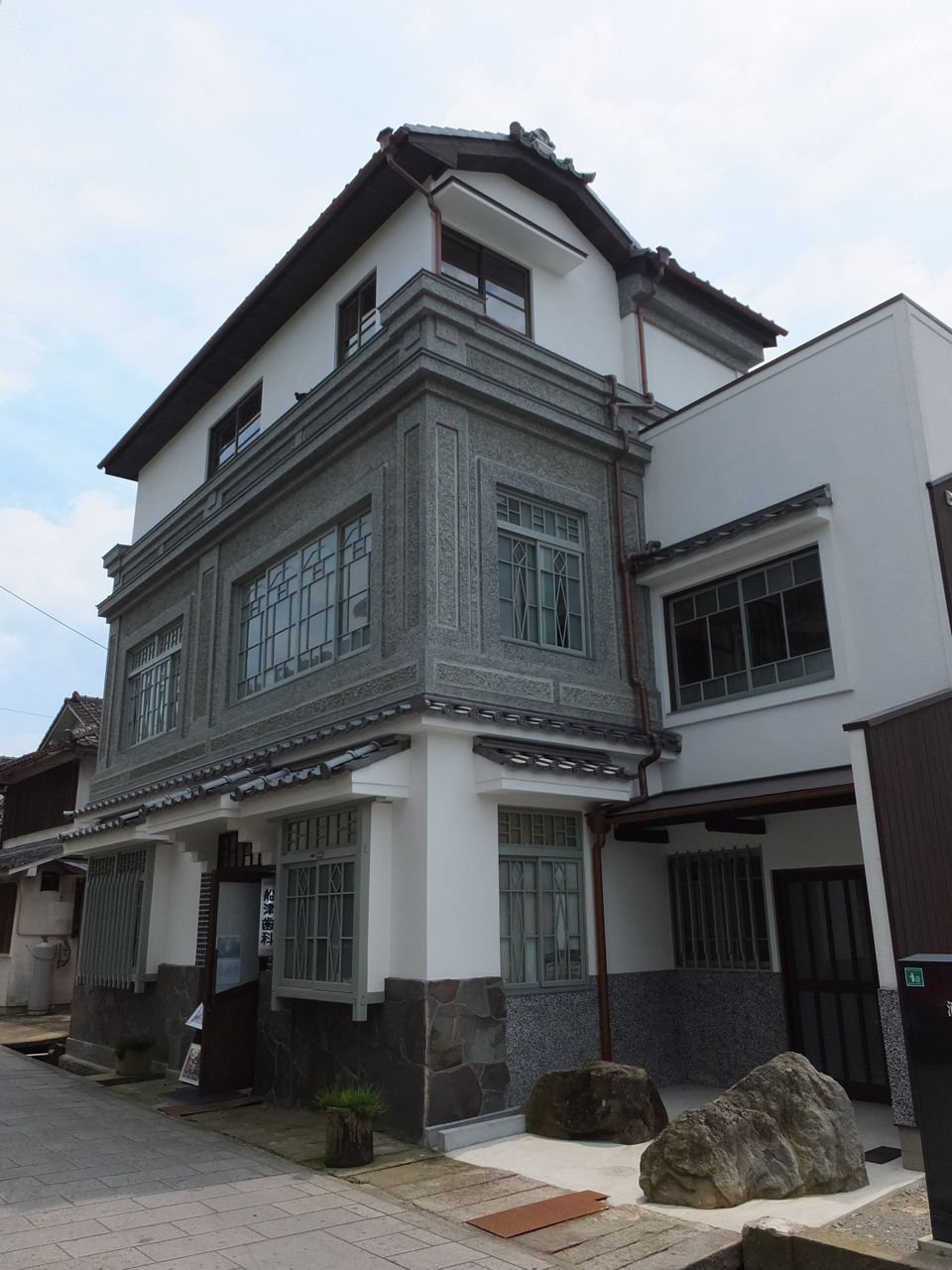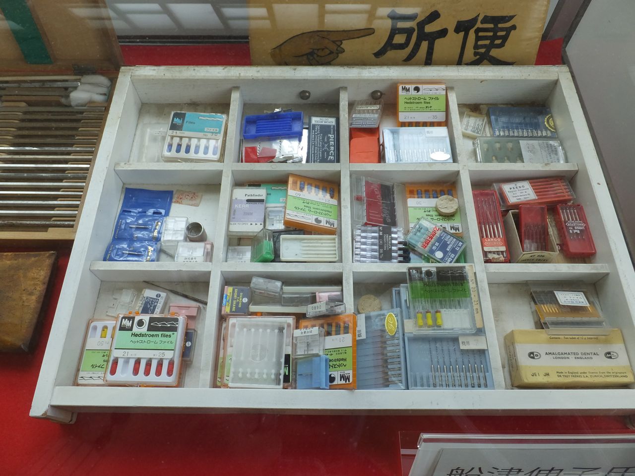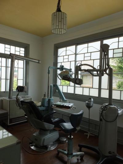 数分先の船津歯医者です。こちらも3階建てで細かい窓桟がきれいな和洋折衷の建物。1階が自宅で2階が医院というおもしろい造りでした。近年まで営業していたようで、椅子はもちろん、歯医者の器具(歯を削るやつとか)もそのまま展示してありました。
