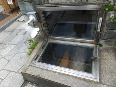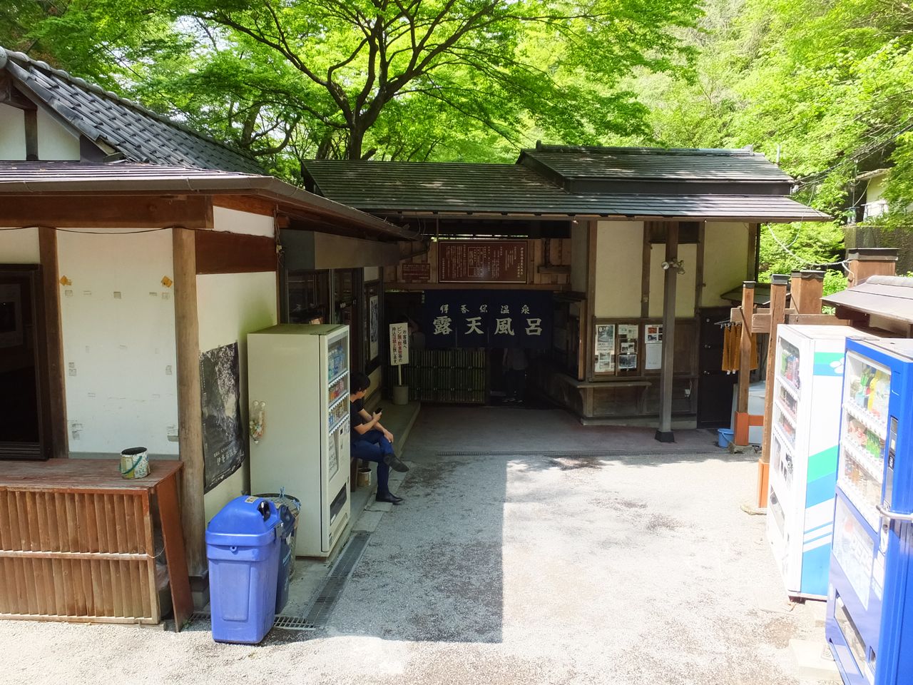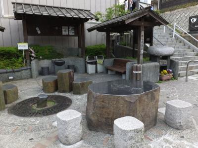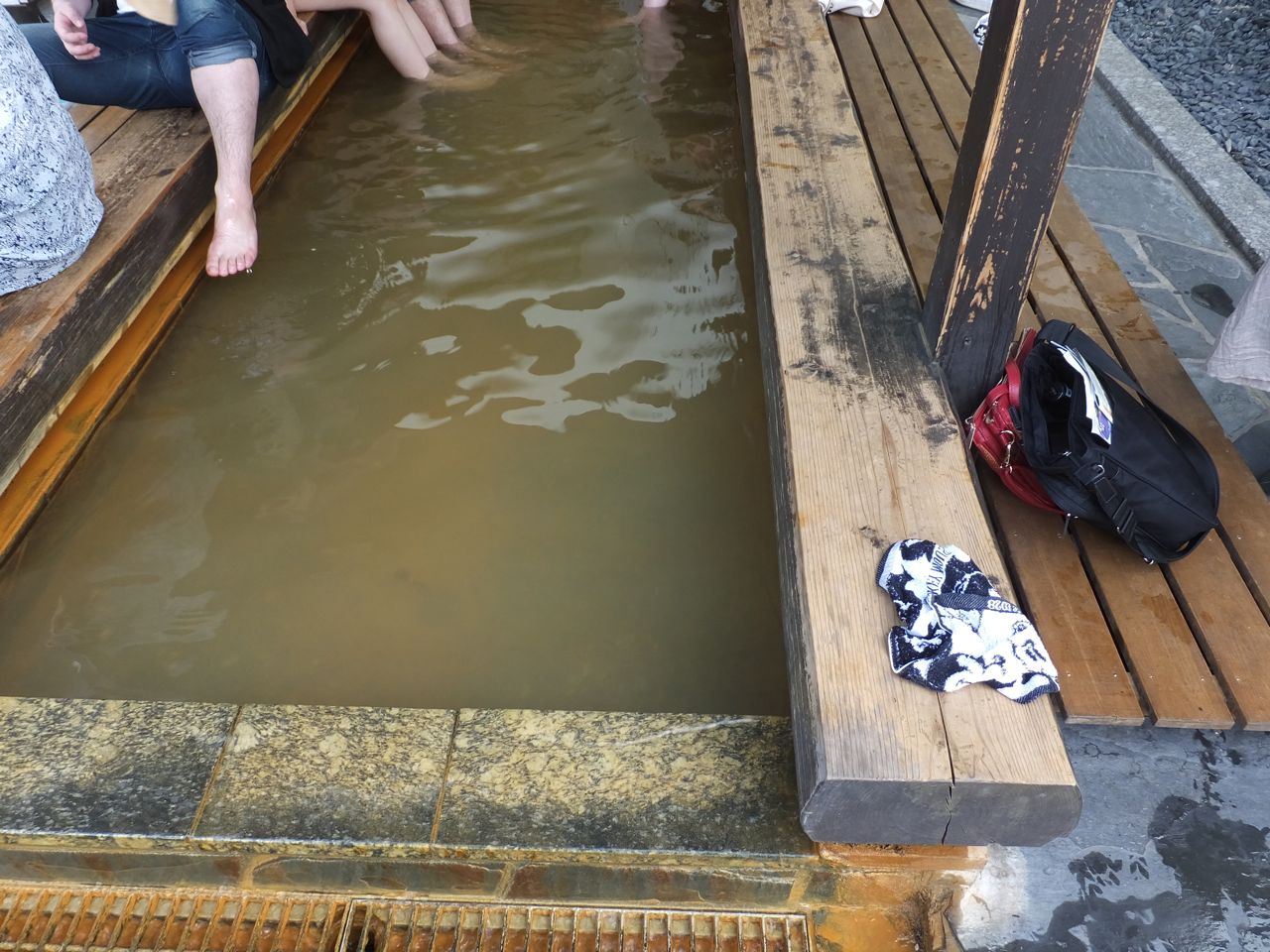 老舗旅館の設営で、その名前を冠してはいますが、無料で自由に入れる足湯です。案外大きく立派な上屋で、10人は入れそうです。石段の直ぐ脇なのでお客さんはひっきりなして常に6人くらいは入っている感じでした。