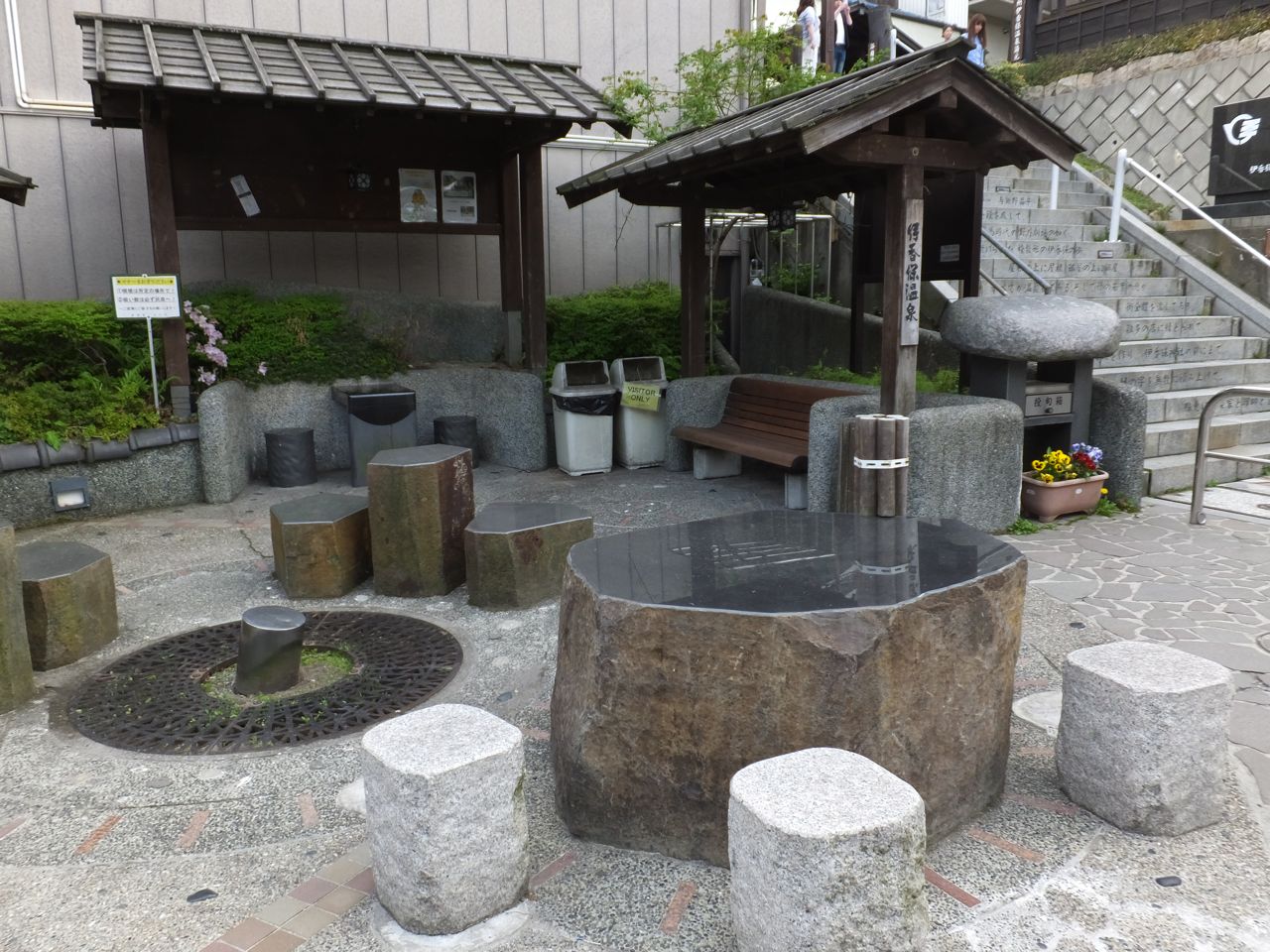 石段街を歩いて疲れた場合に無料で休憩できる施設が数カ所ありますが、これはそのひとつ。石段街のちょうど中間くらいです。小さなスペースですが、日射を遮る屋根もありますし、石を磨いただけの椅子が数種10脚くらいあります。なお、直ぐ近くには「いっぷく館」という休憩所もあります。夏の炎天下や疲れたときにの水分補給など、はやめに休みましょう。