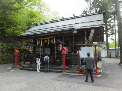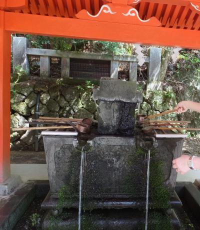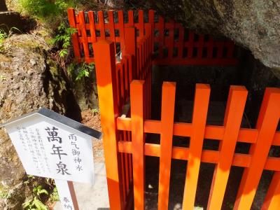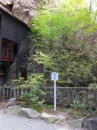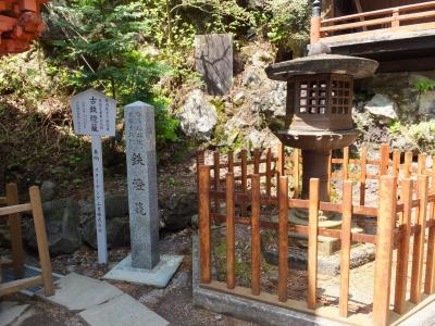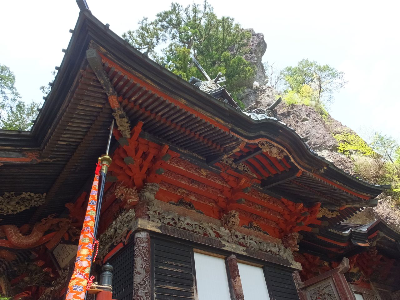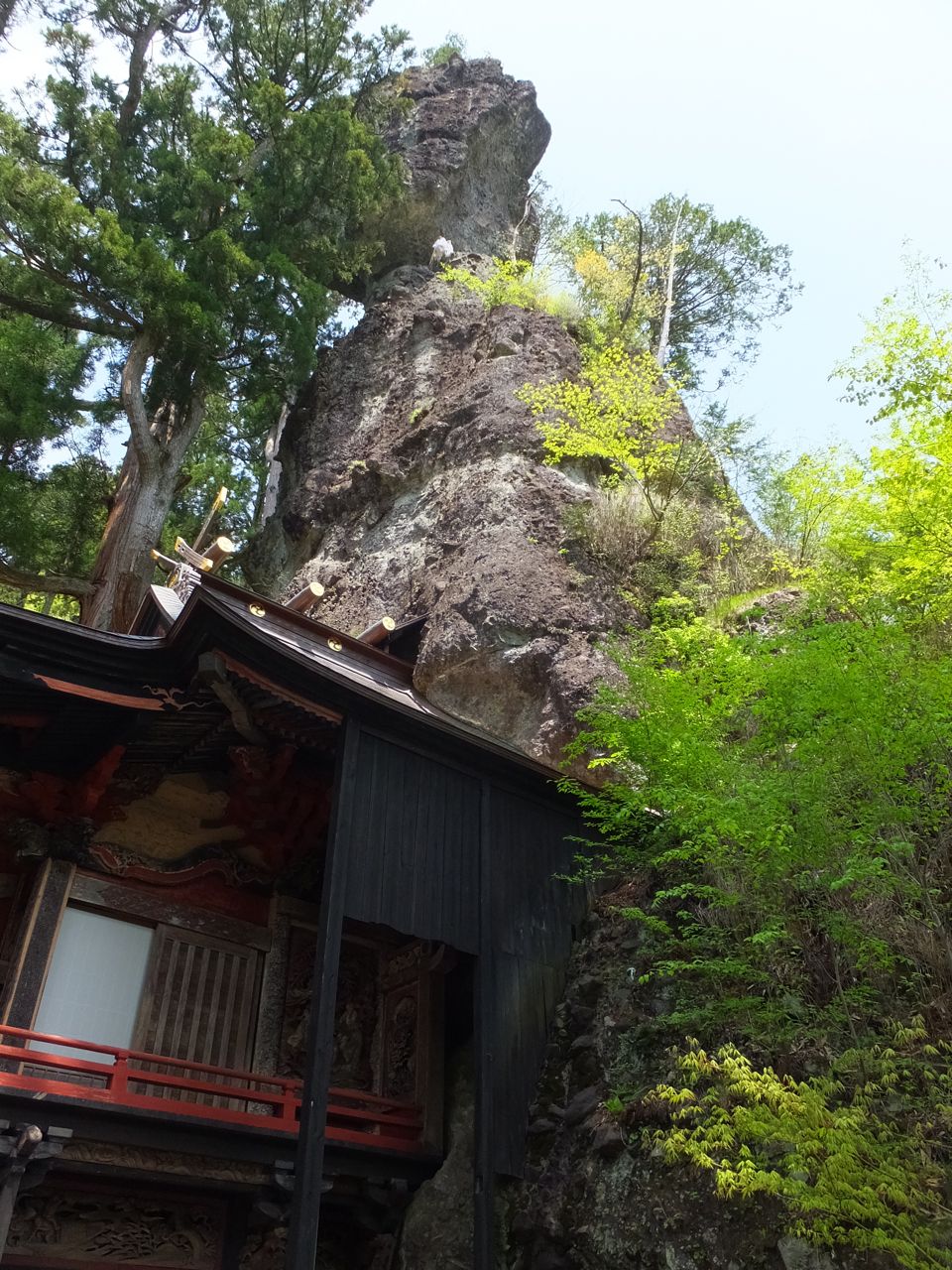さて、正面の拝殿は黒が主体に赤が挟まるビビッドは配色。一瞬戦艦「榛名」の名が浮んだくらい力強さを感じました。横に廻ると本殿が岩に食い込んで建っているのがわかります。中がどうなっているか気になるところですが、普通、大きな神社では拝殿までしか入れないので、ここは本社が見られるだけでもありがたい、というべきでしょう。